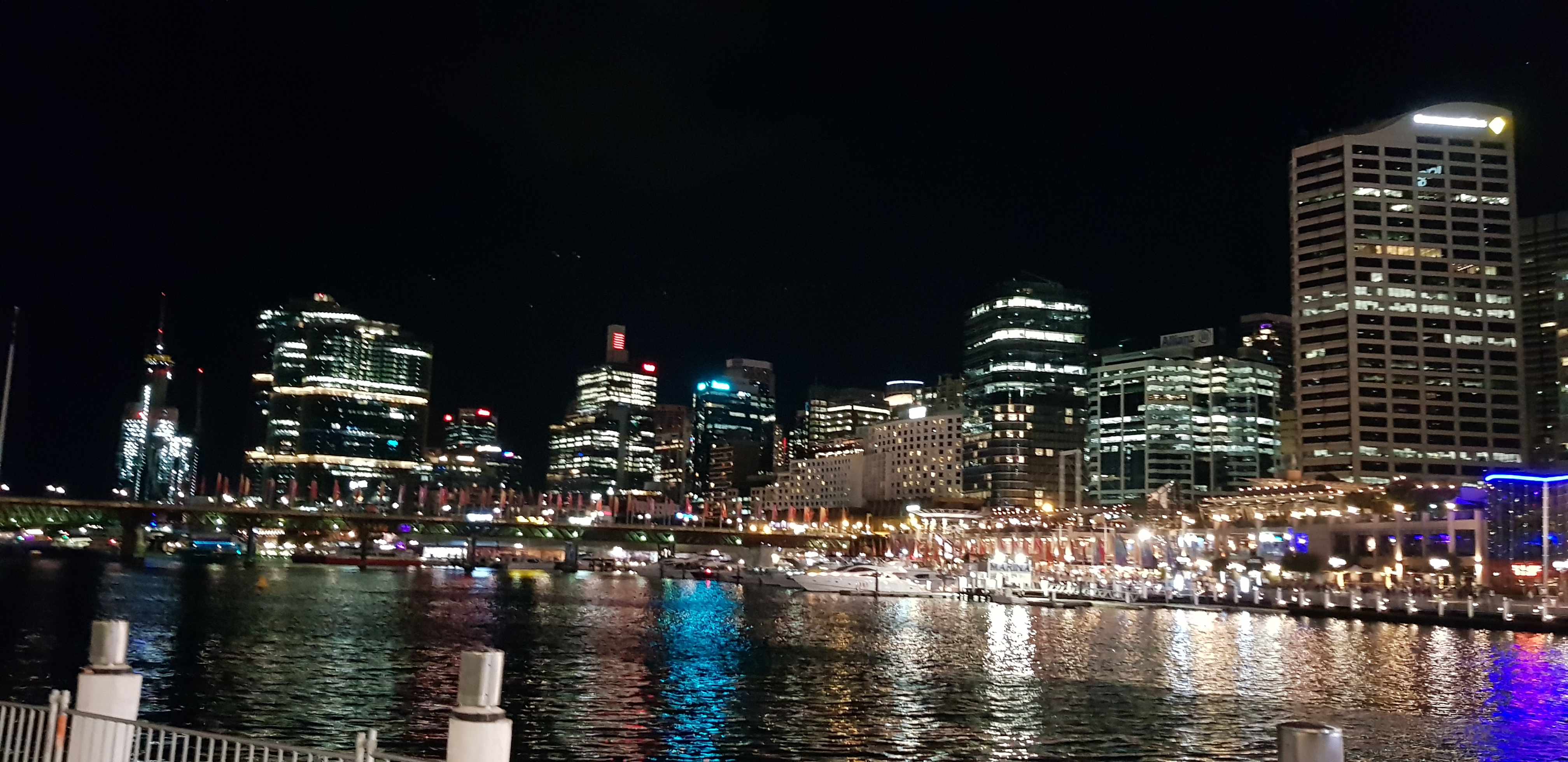 Väl framme i Sydney får vi snabbt tag på en taxi som tar oss till vårt boende i centrala Sydney men nu har klockan hunnit bli åtta på kvällen. Vi får en snabbguidning av receptionisten och väl ute på stan kan vi konstatera att vi bor riktigt bra och mycket centralt nära Darling Harbour.
