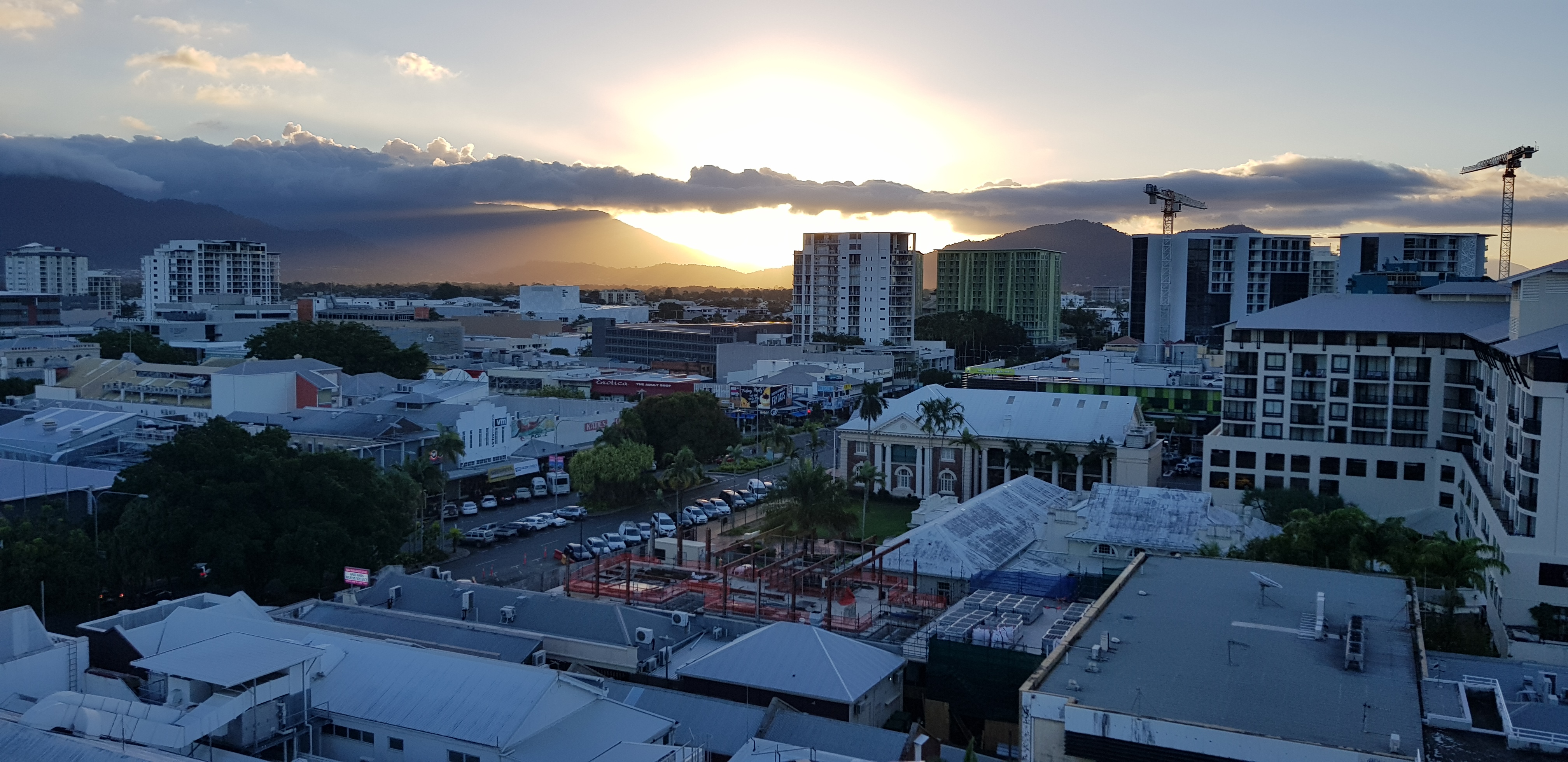Jag har valt boende på ett trevligt hotell bara två minuters promenad från The Reef Felet Terminal, Därifrån vi anländer med färjan från Fitzroy Island. Hotellet ligger mitt på huvudgatan The Esplanade, vi får ett rum högt upp i byggnaden och har fin utsikt över både havet och en del av staden. Tyvärr är det väldigt varmt på balkongen men senare mot kvällen sitter vi här och kan se lite av solnedgången.