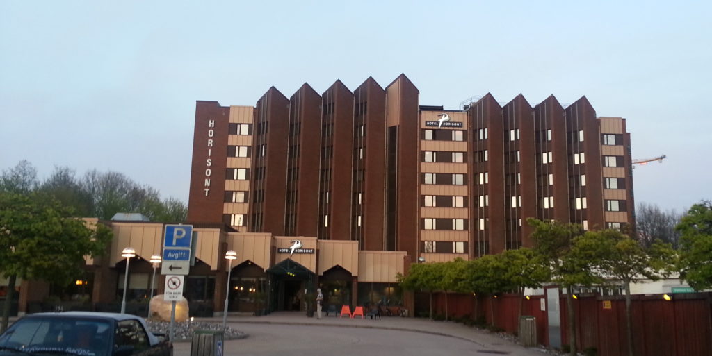 Vi bor på Hotell Horisont strax söder om färjeterminalen.