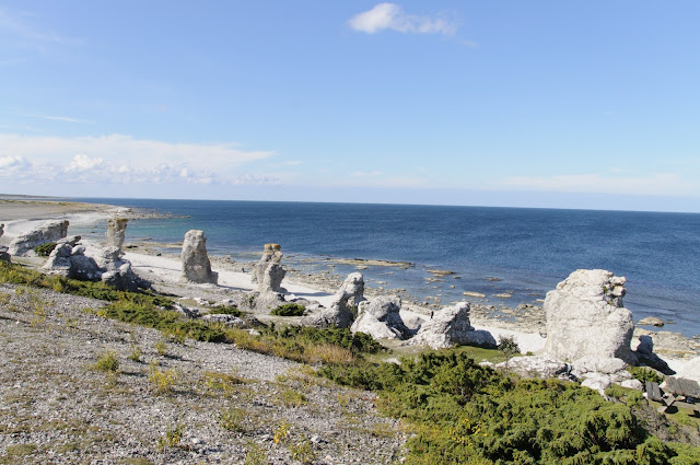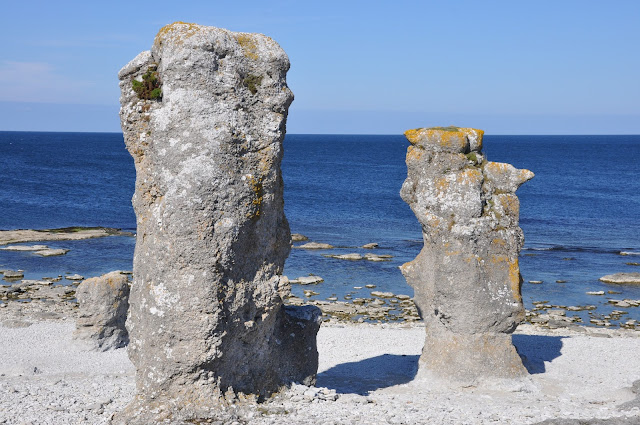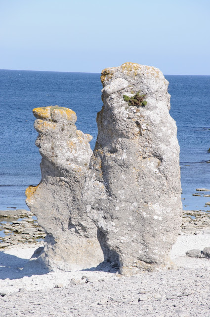 Vårt första mål är att se raukarna och vi stannar till vid Langhammars naturreservat och får se de häftiga stenformationerna.