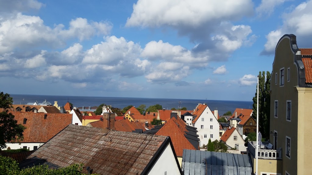 Väl framme i Visby är det strålande sol. Vi har fixat hyrbil hemifrån och på några minuter är vi framme vid vårt boende på hotell Almedalen. Det är ett supertrevligt hotell alldeles vid havet och ringmuren med bra rum och nära till parkeringsplats.