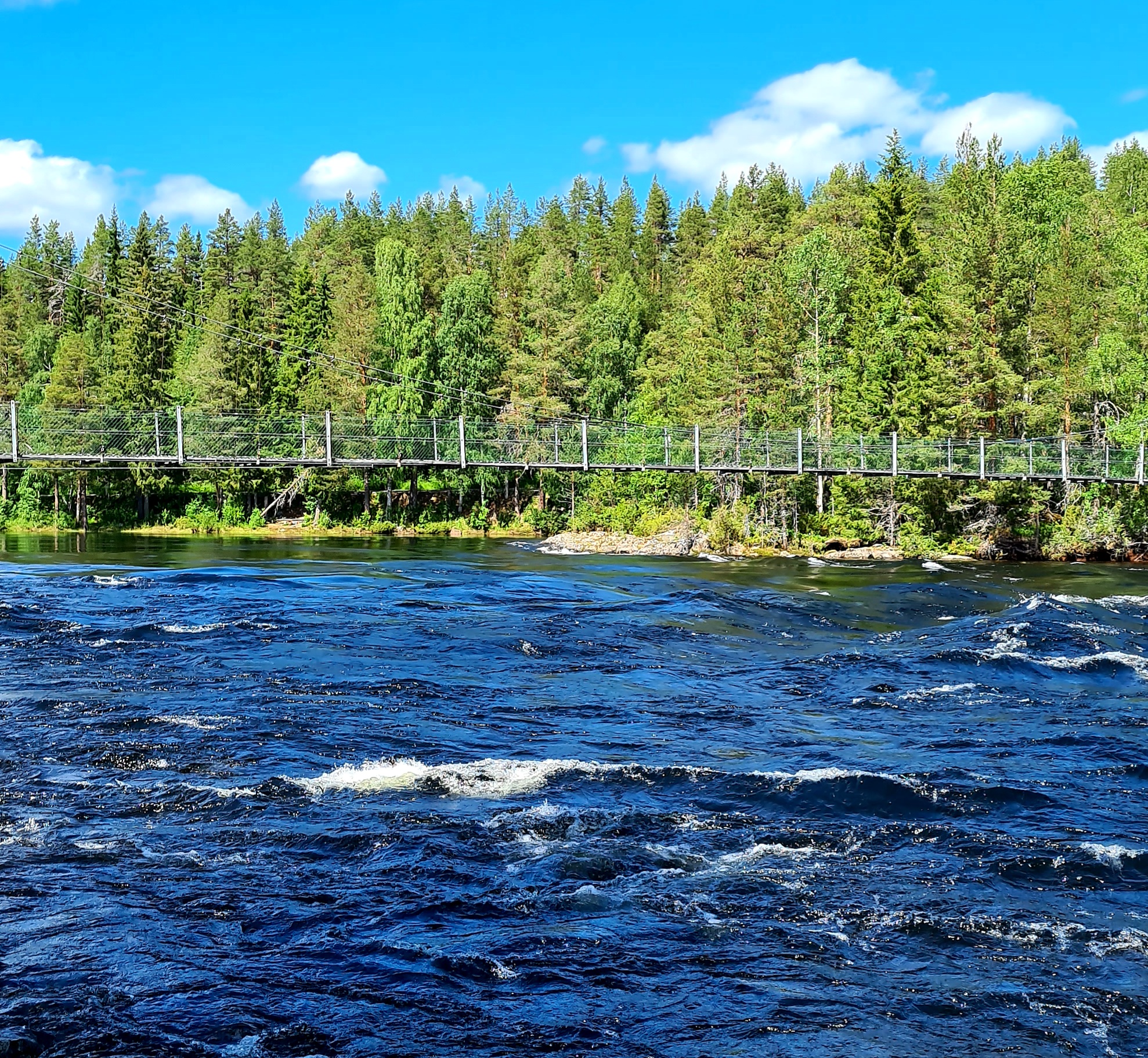 Den första bron som tar oss över den bredaste delen av forsen svajar i mitt tycke lite otäckt men är förmodligen helt säker att gå på om man följer rekommendationerna för antalet personer som får vistas på bron samtidigt. Det är dock inga problem att ta sig över när jag vant mig med det lilla ”gunget” som känns värst i mitten av bron. Väl över bron leder en stig oss till nya broar och småöar. På vissa ställen är plankor utlagda för att man ska kunna gå runt en liten slinga på dryga kilometern. Det är en riktigt trevlig promenad och ett lättillgängligt sätt för att beskåda den dramatiska forsen i Vindelälven.