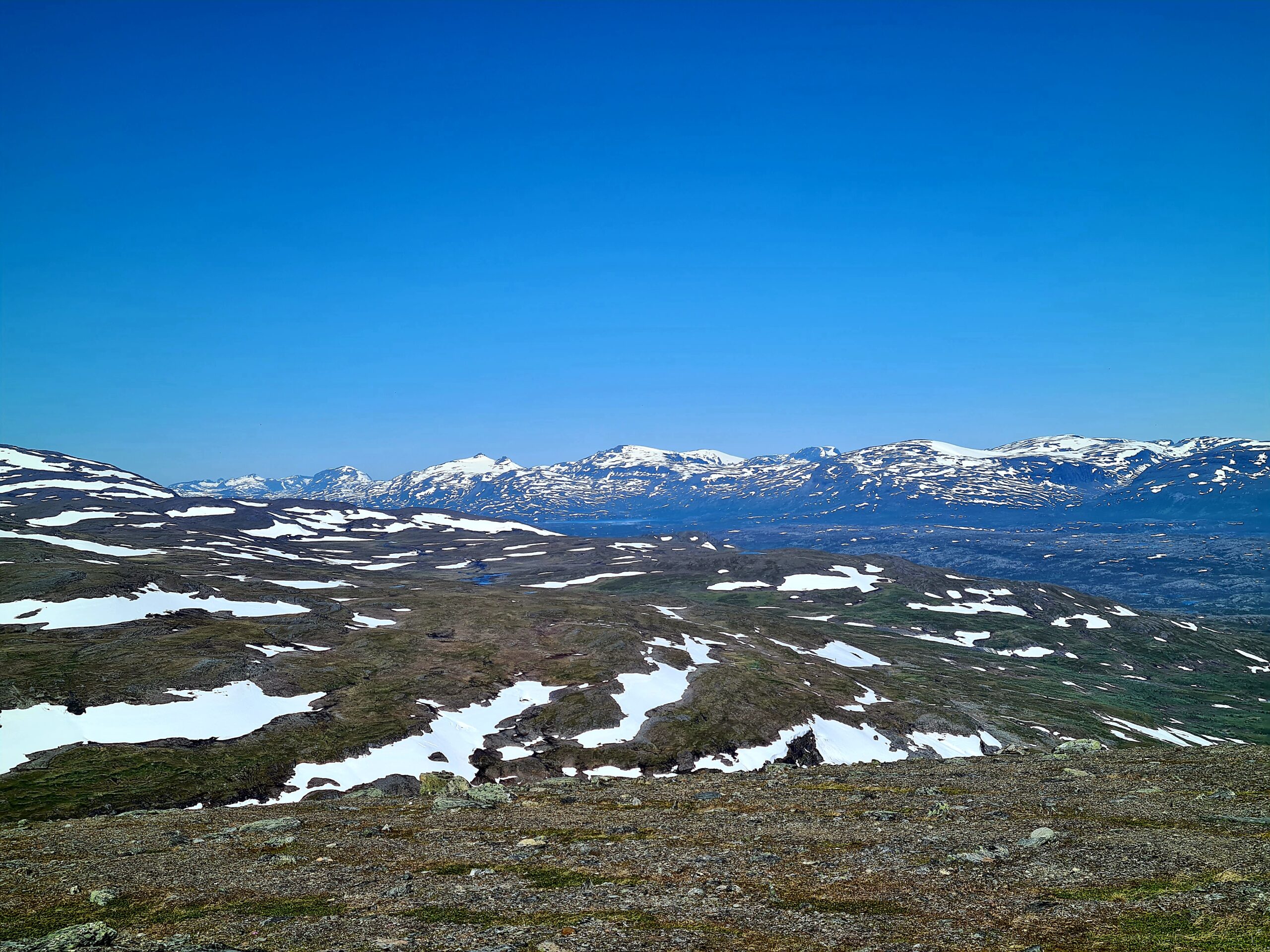 Vi tänker att toppen på Njullá kanske kan räcka idag. Det är bara 2 km från liftstationen att gå men det går uppför och i värmen tar det en hel del på krafterna. Ganska snart når vi toppen och här uppe är vyerna storslagna.