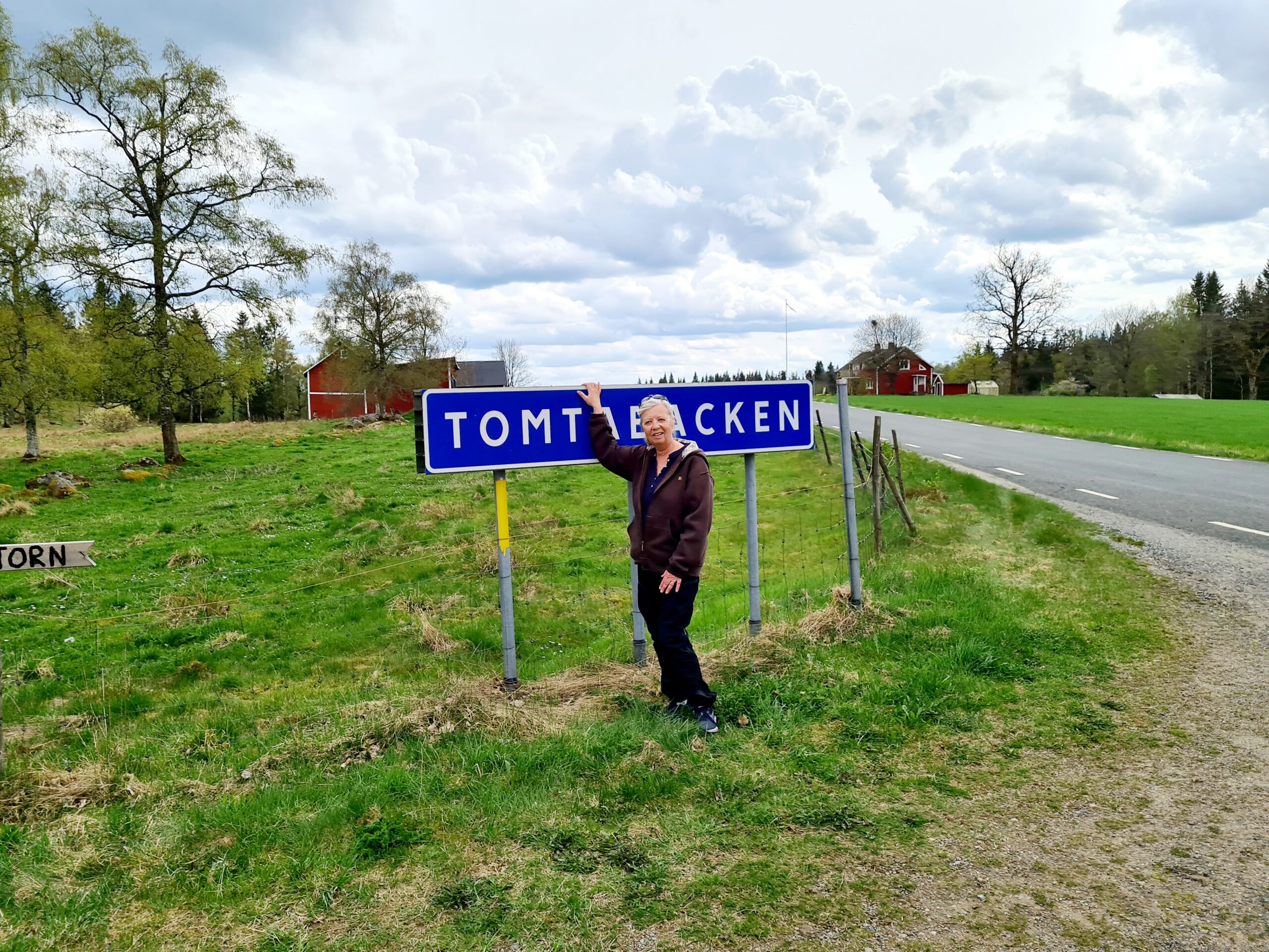 Glada över att det inte var så svårt att hitta rätt kör vi in på den lilla parkeringsplatsen som ligger utmed vägen och skylten ”Tomtabacken”. Det finns även en liten informationsskylt och om jag inte minns fel fungerar parkeringsplatsen som en liten rastplats med bänkar och bord.