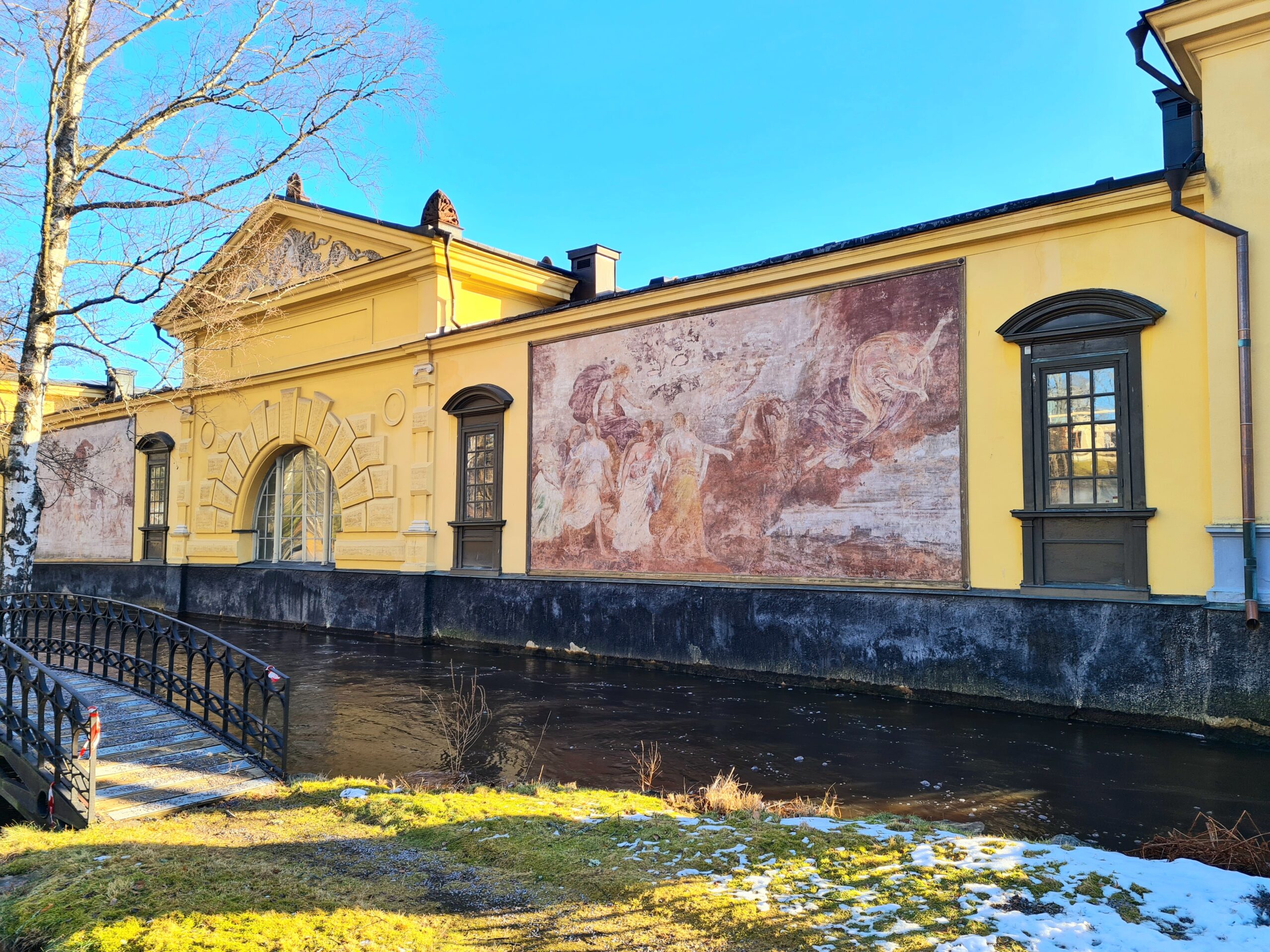 Pampiga byggnader i slottsparken vid Finspång slott.