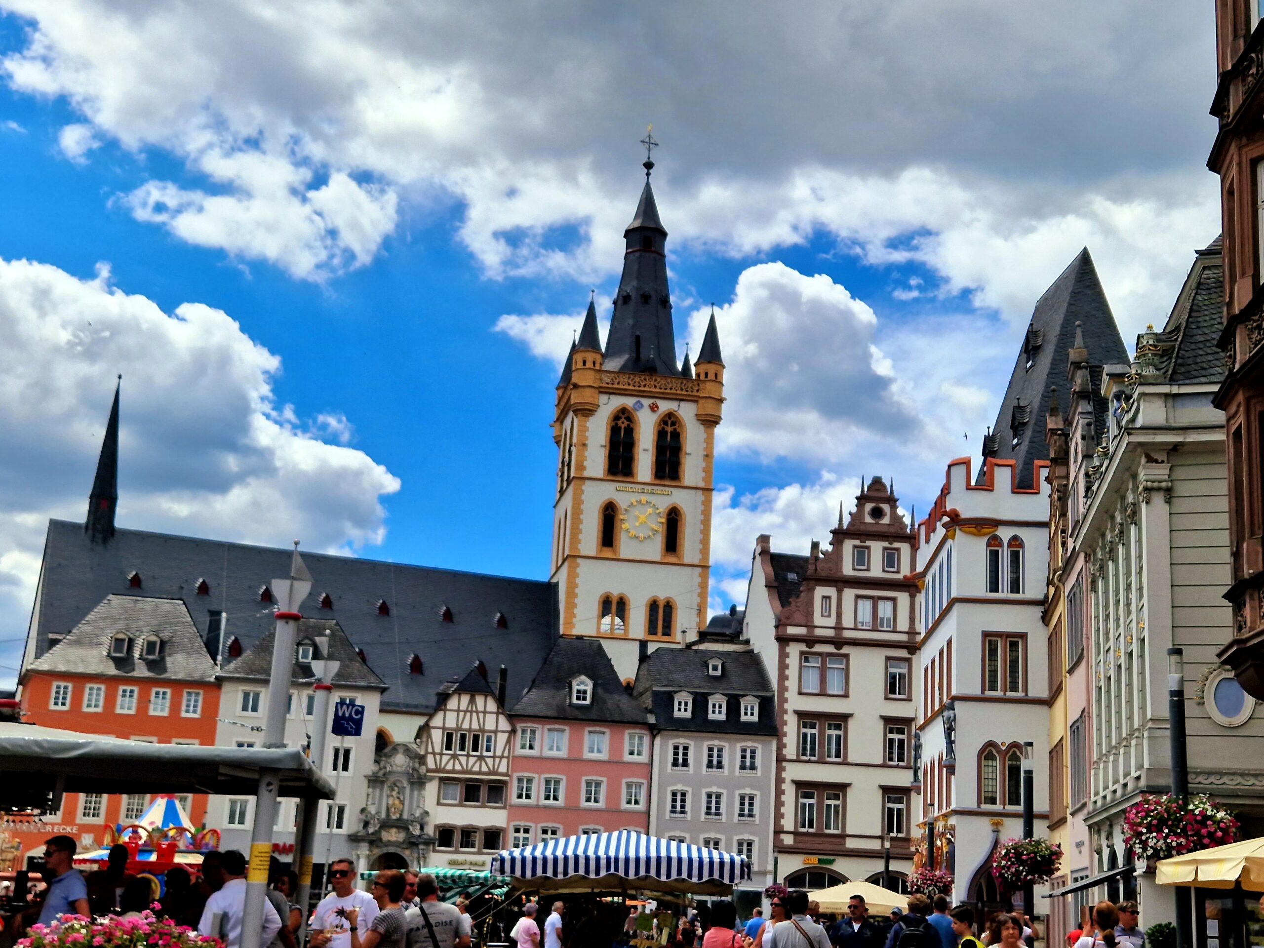 Runt torget ligger många vackra hus i milda pastellfärger och ett par kyrktorn sticker upp i kvarteren lite här och där. På torget ser vi fler gatumusikanter som spelar violin med passande tema för Trier. Känslan av en annan tid infinner sig, vi kastas tillbaka i tiden genom musik och de vackra byggnaderna. Även om romarna en gång i tiden har präglat en del av Trier går mina tankar mer åt den tid då den romantiska tidens ideal var högsta mode. Vackert men samtidigt lite sorgsamt.