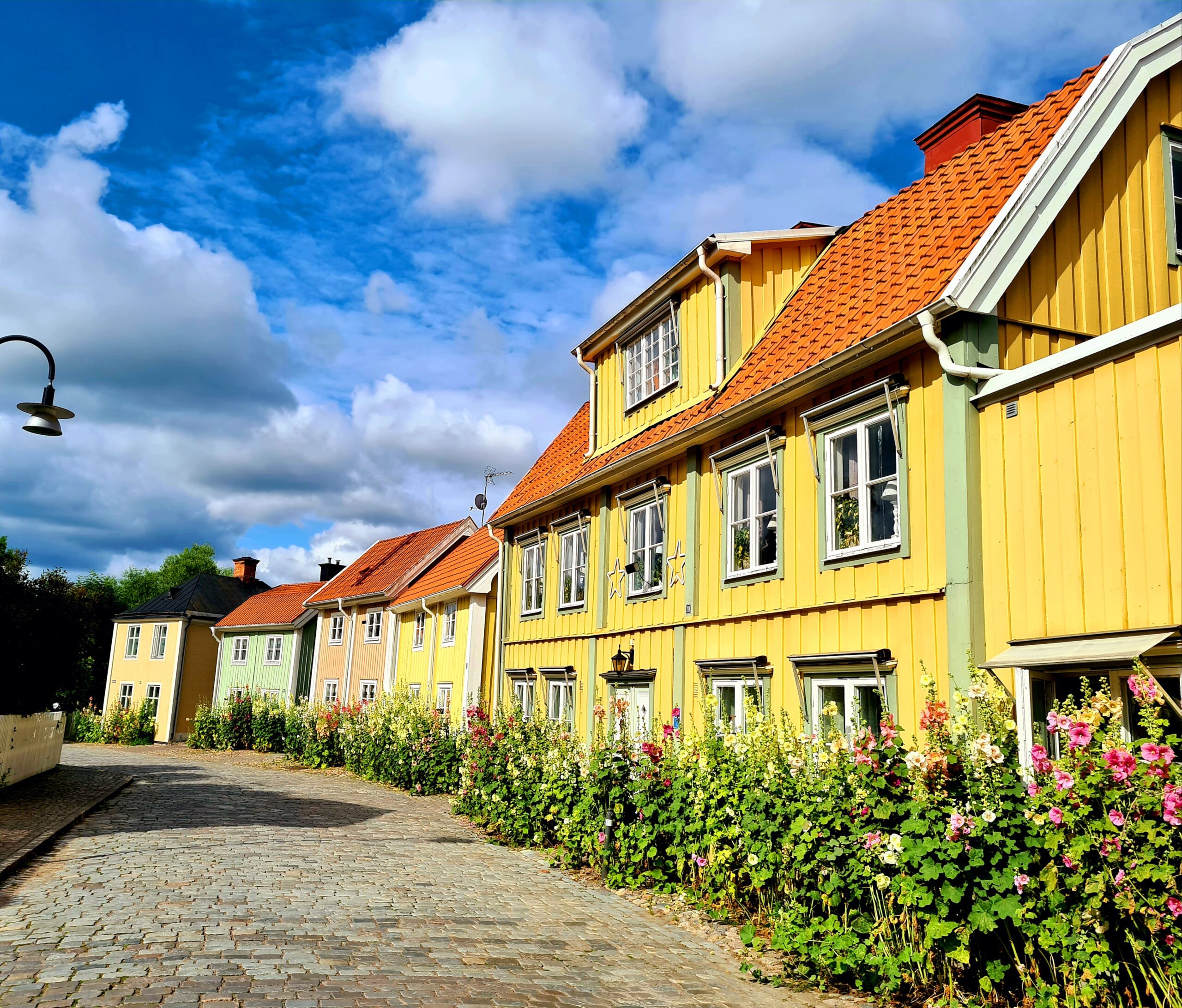 Vi njuter av vår stillsamma förmiddagspromenad och tar in på en gata med de mest små söta hus i milda pastellfärger som vi knappt kan slita ögonen ifrån. Kameran åker fram och det fotas för glatta livet. Stockrosrabatterna är fyllda med blomklasar i mjuka gula, rosa, aprikosa och vita färger som matchar husfasaderna så fint.