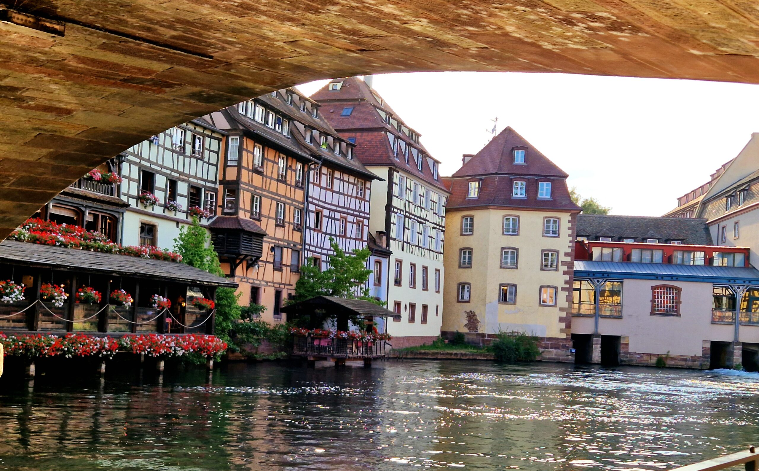 Till den historiskt viktiga sjöfartsleden, floden Rhen, ingår bifloden Ill, vilken rinner genom Strasbourg. Det ger staden både charm och kanske lite svalka, tror vi. Intill floden ligger olika byggnader, en del riktigt gamla, andra yngre.