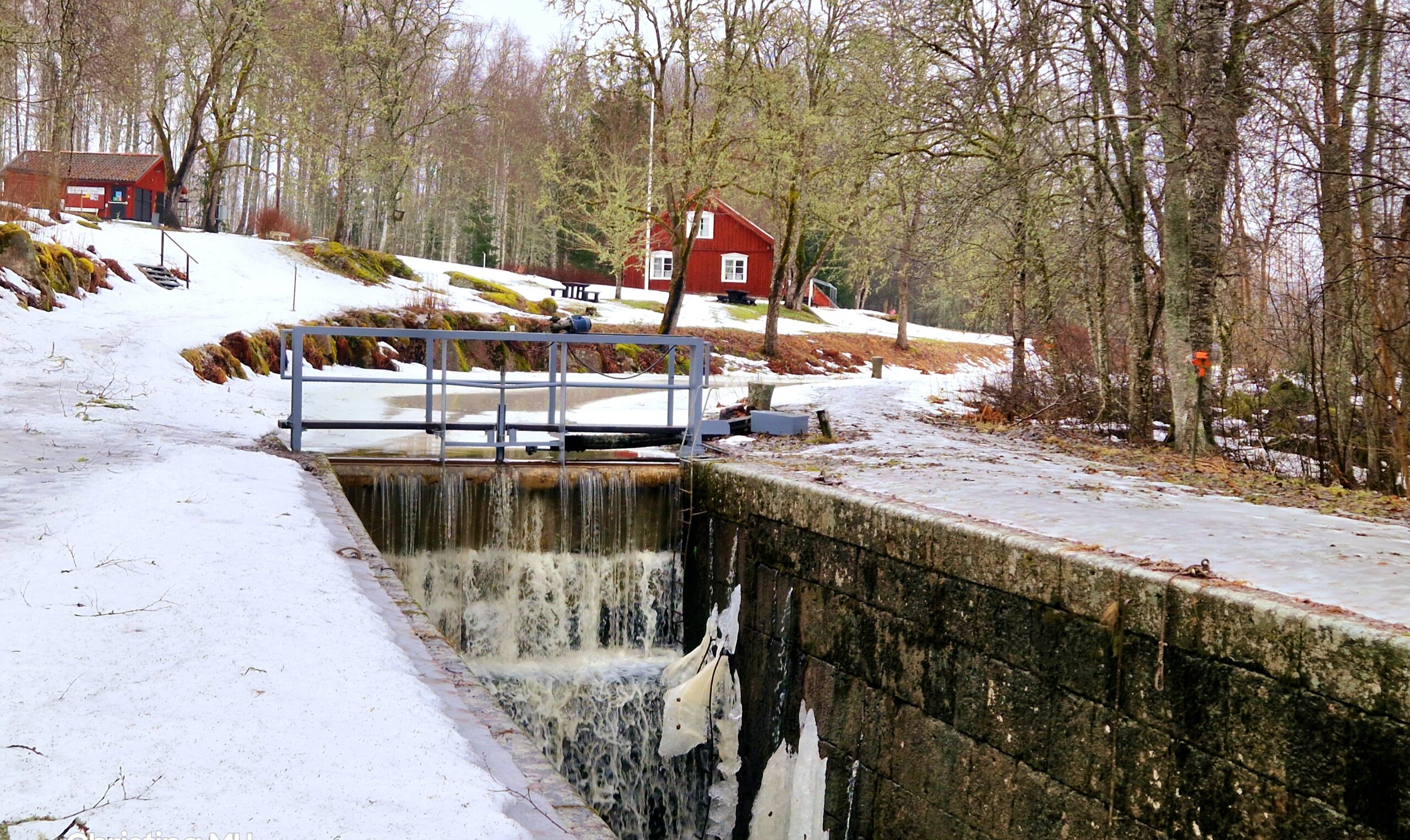 Vi passerar kanalen och tar oss vidare på isiga vägar och hamnar vid Bjurbäckens slussar. Ett område som säkert är fantastiskt vackert en vår- eller sommardag. Nu ska erkännas att det känns lite sådär. Bilen parkerar vi på en infarten till vägen mot slussområdet eftersom det råder ishalka i den lilla backen som går ned mot slussen. På halkig väg och blöta snödrivor tar vi oss till sist fram till slussen, och här händer det inte mycket idag då isen ligger tjock i kanalen, men vi får åtminstone se en sevärdhet i kommunen Storfors.