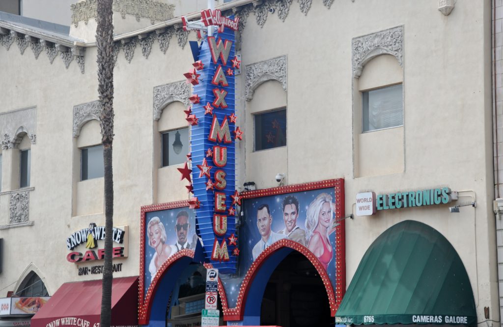 Vi går förbi det klassiskt vaxdocksmuseum på Hollywood Boulevard, det har funnits sedan 1965 och visar replica‑figurer av kända celebriteter. Det är mer traditionellt som ett klassiskt vaxmuseum med många olika figurer att kolla in.
