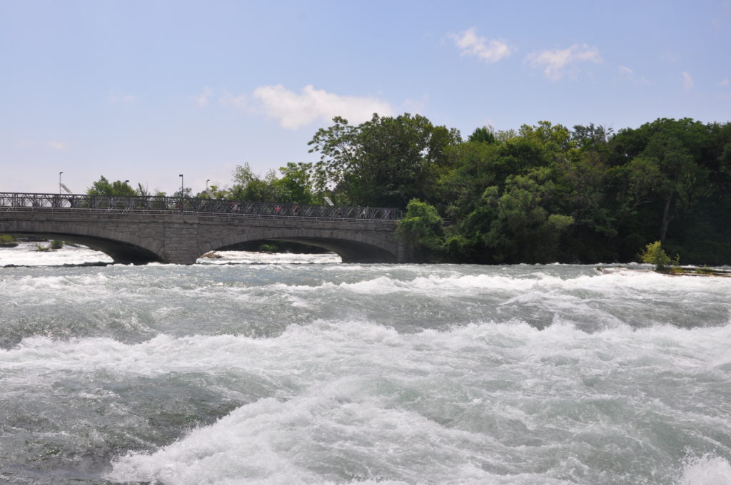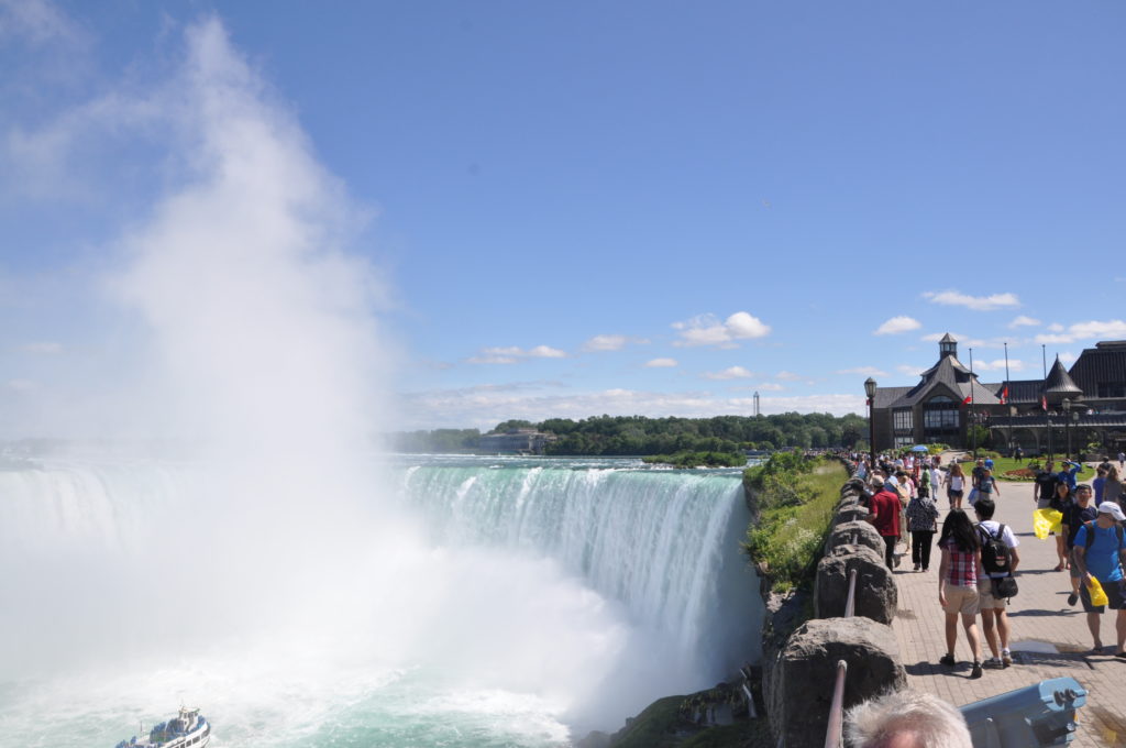 Vi kommer ner till breda gångvägen som löper längs kanten ovanför fallen, här finns flera utsiktsplatser där man kan stanna för att se ut över den mäktiga vyn. Dånet från vattnet är konstant och ju närmare Horseshoe Falls vi kommer, desto mer känns kraften, nästan så att marken vibrerar lite under fötterna.