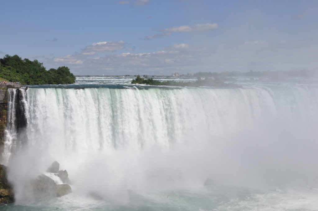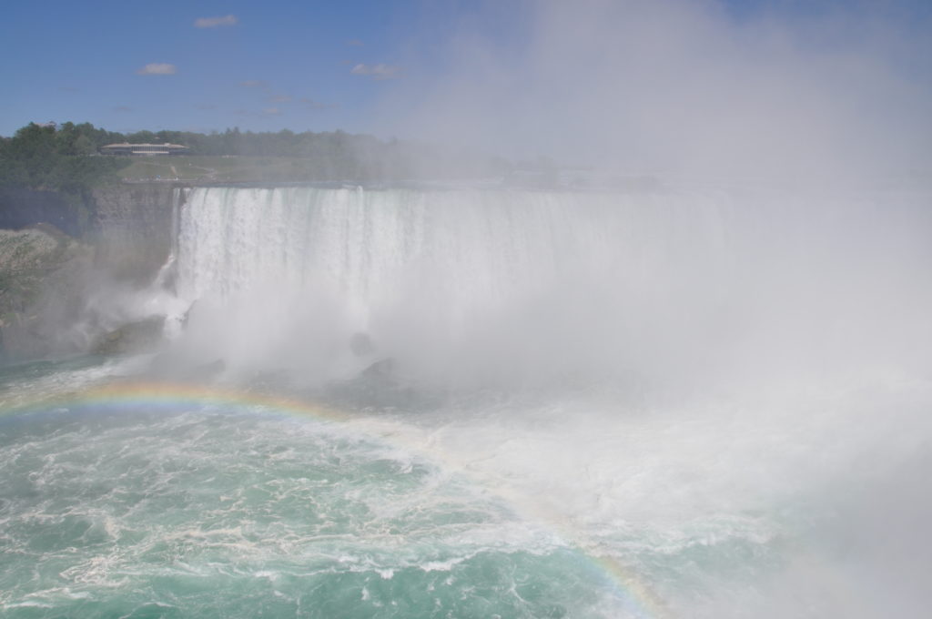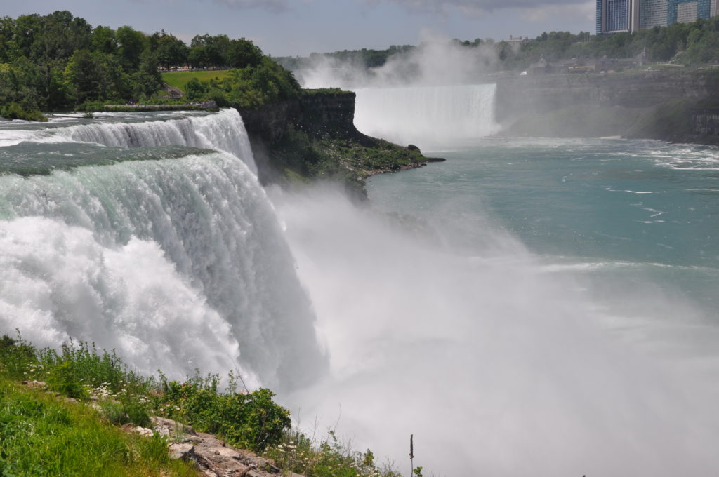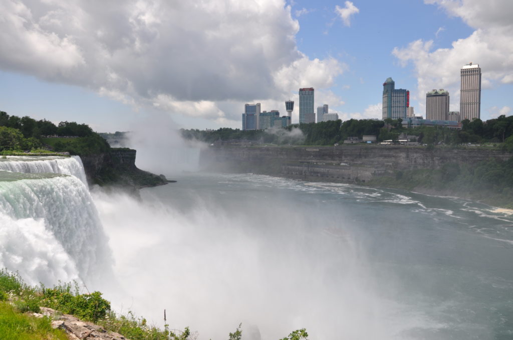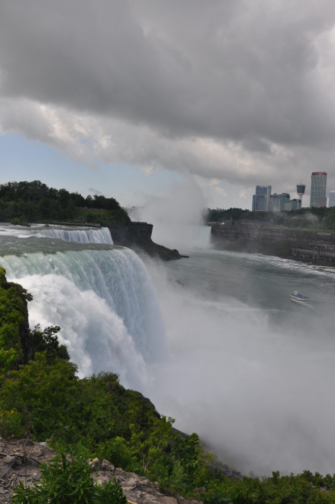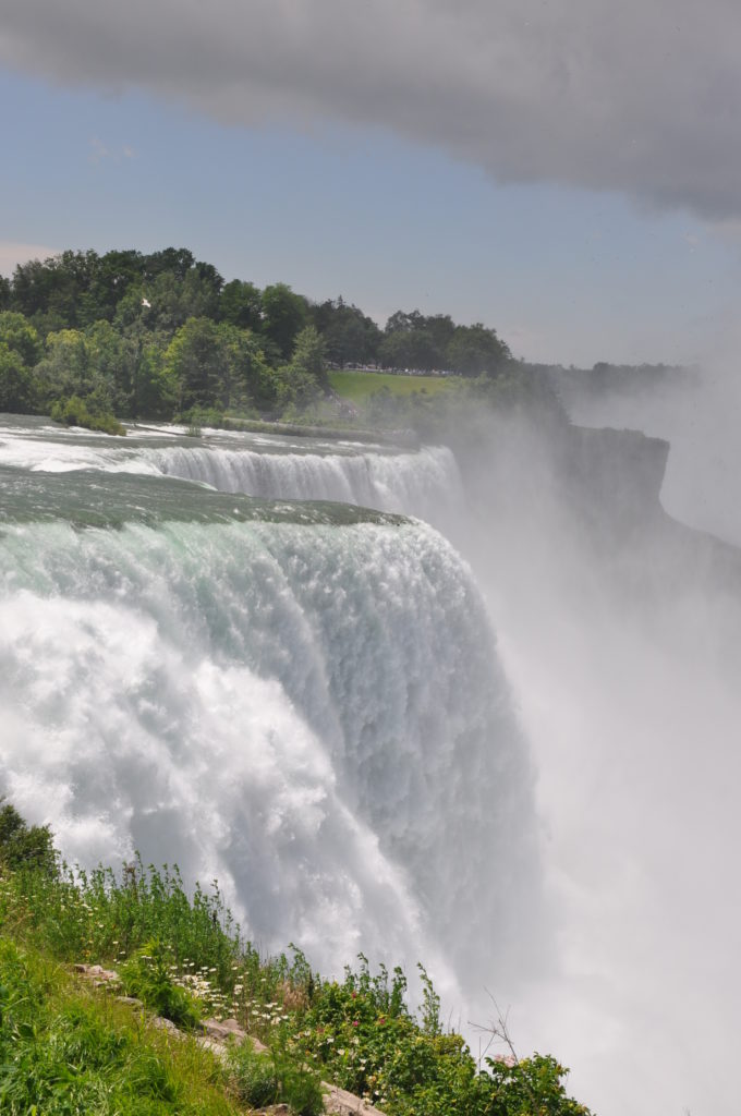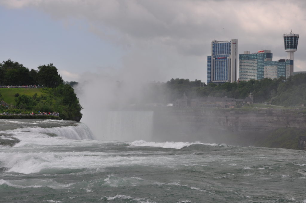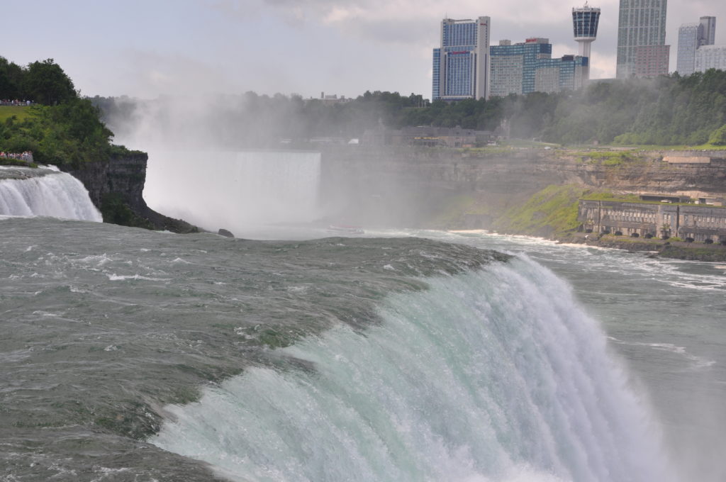 Vi startar vårt besök vid Niagara Falls State Park på den amerikanska sidan som också är riktigt häftigt. Vi har en fin överblick över stora delar av landskapet. Vill man kan man även göra ett besök i ett 73 meter högt Prospect Point Observation Tower. Det finns flera båtturer man kan göra nere vid själva fallen och det verkar vara en blöt historia. Själv tycker jag att upplevelsen är rejält häftig även från land.