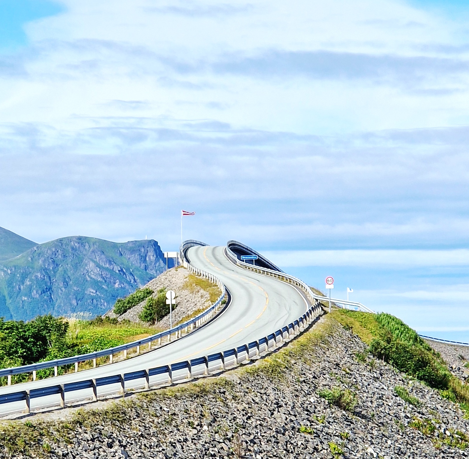 Snart når vi ändå starten eller slutet av Atlanthavsvägen beroende från vilket håll man kommer. Vägen slingrar sig fram över små öar, holmar och skär som är sammanbundna av åtta broar. Den mest ikoniska är Storseisundbrua, med sin karakteristiska böjda form som nästan ger illusionen av att vägen kastar sig rakt ut i havet.