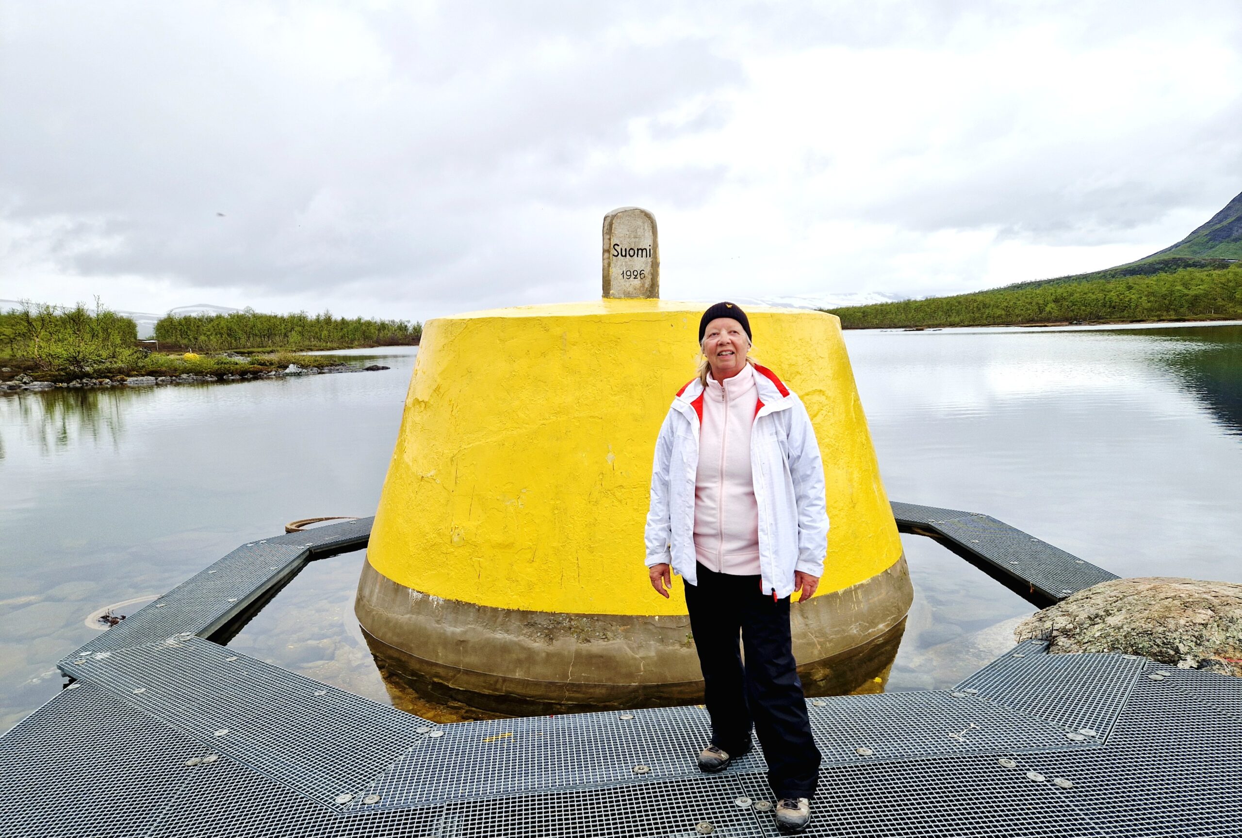 Vi blir kvar en stund runt monumentet men någon vidare sikt har vi inte mot fjälltopparna som ligger precis bakom Treriksröset. Det är dock inte lång tid vi kan stanna kvar här ute. Vi måste ju gå tillbaka till båten som stannar max två timmar. Några i vårt gäng väljer att vandra tillbaka de 11 kilometerna till Kilpisjärvi men vädret är alldeles för trist för det och för att inte tala om myggen. Bara att gå snabbt.