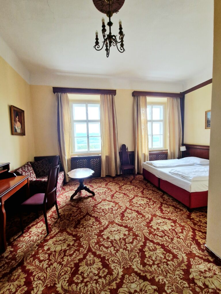 Vi bor i ett superiorrum med vacker utsikt över naturområdet och slottsgården. Rummet är möblerat med en soffa och tillhörande bord, ett litet skrivbord, en säng samt sängbord. Badrummet är rymligt och relativt modernt. Även om rummet i grunden är ganska vanligt, är det takhöjden som skapar den slottskänsla jag förväntar mig när jag bor på ett slott.