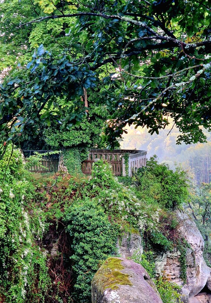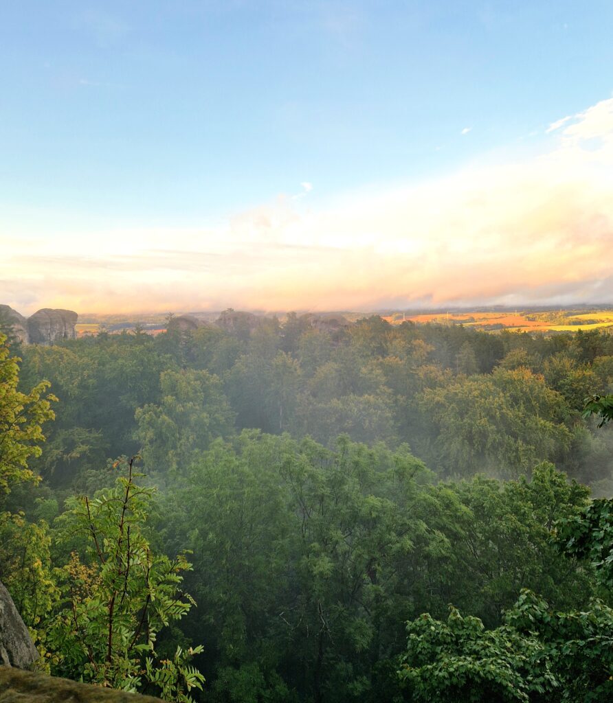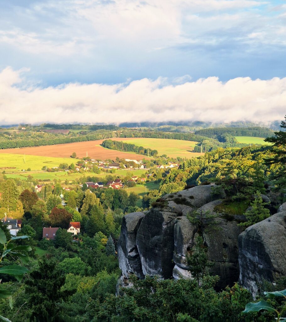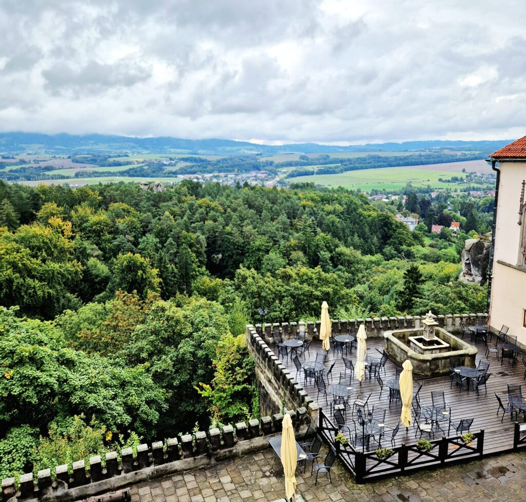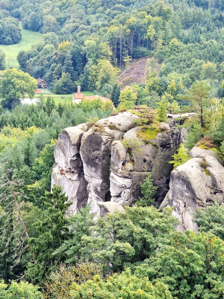 Slottet Hrubá Skalá är byggt ovanpå höga sandstensklippor som reser sig cirka 60 meter över marken, vilket ger en spektakulär utsikt över det omgivande landskapet. Det är dessutom omgivet av de så kallade ”Hruboskalské skalní město” ett ”klippstads”-liknande område fyllt med smala pelare och höga klippor, mycket populärt bland vandrare och som vi också besöker under eftermiddagen.