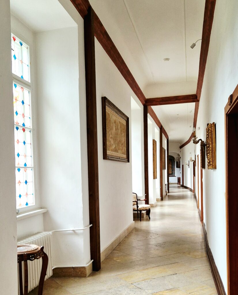 Korridoren på våningsplanen ger en äkta slottskänsla och man har försökt möblera med möbler som passar i slottsmiljö. Det rubusta stengolvet har bevarats och fönstren är dekorerade i vackert mönster.