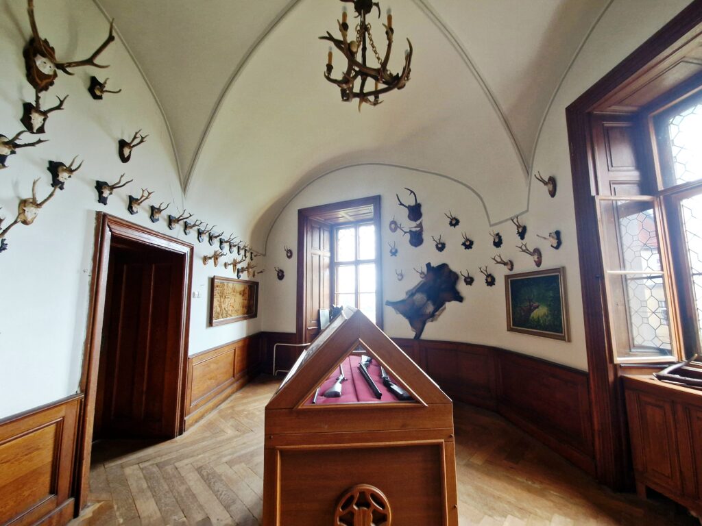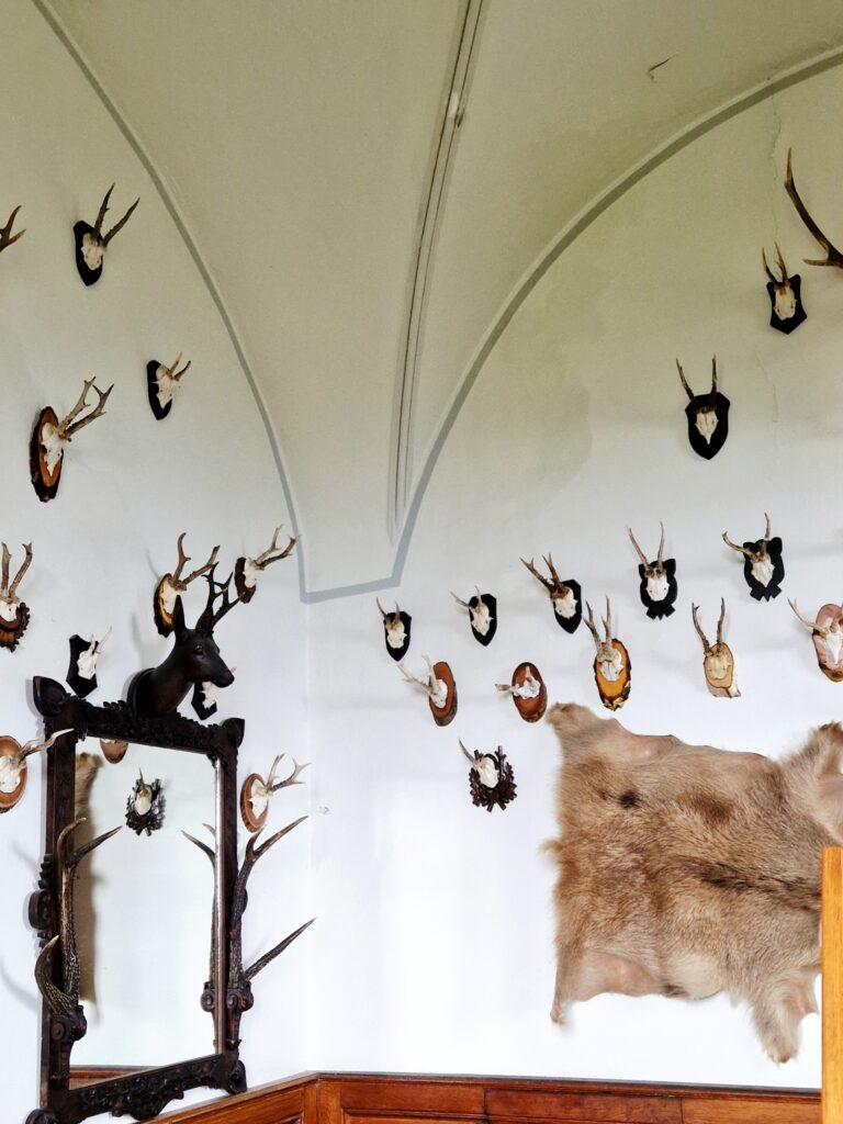 Jakttroféerna är uppsatta på väggarna och det ger en känsla av att vi befinner oss på ett jaktslott. Det är kanske inte så konstigt eftersom naturen runt om förmodligen var goda jaktmarker än gång i tiden.