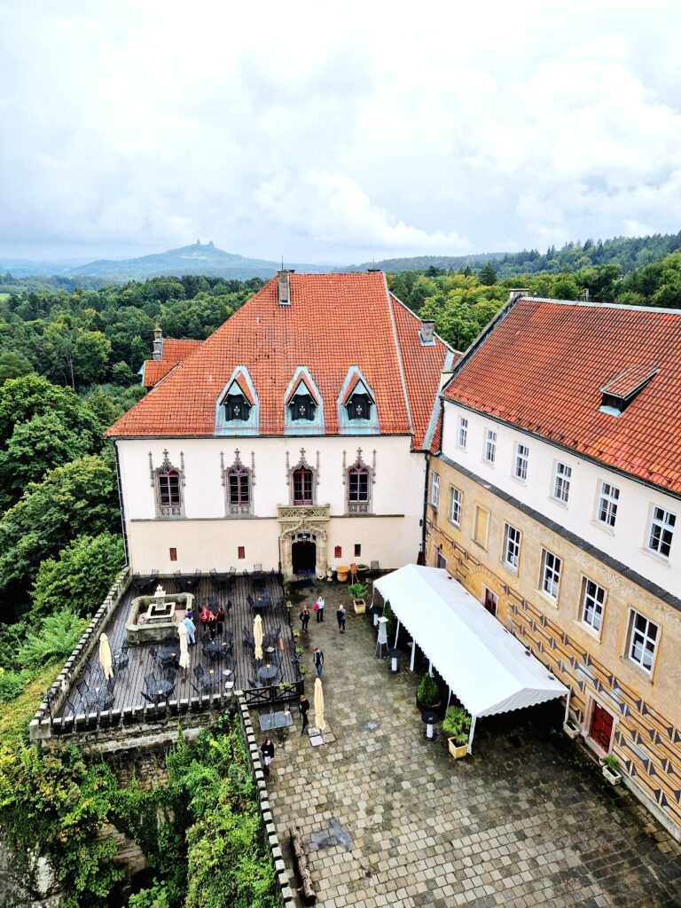 Från tornet har vi fin utsikt ned mot slottsgården där man har en terrass och en utomhusservering under tak. Under vår vistelse i mitten av september är det inte mycket folk som bor på hotellet men däremot är det gäster utifrån som besöker hotellets restaurang.