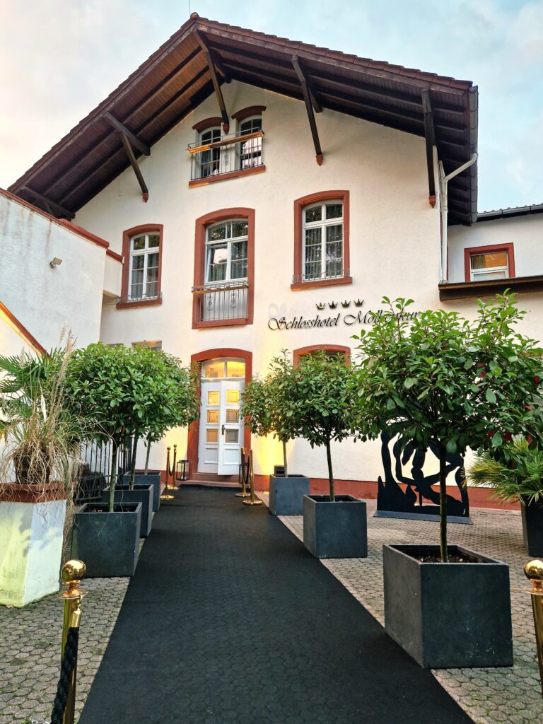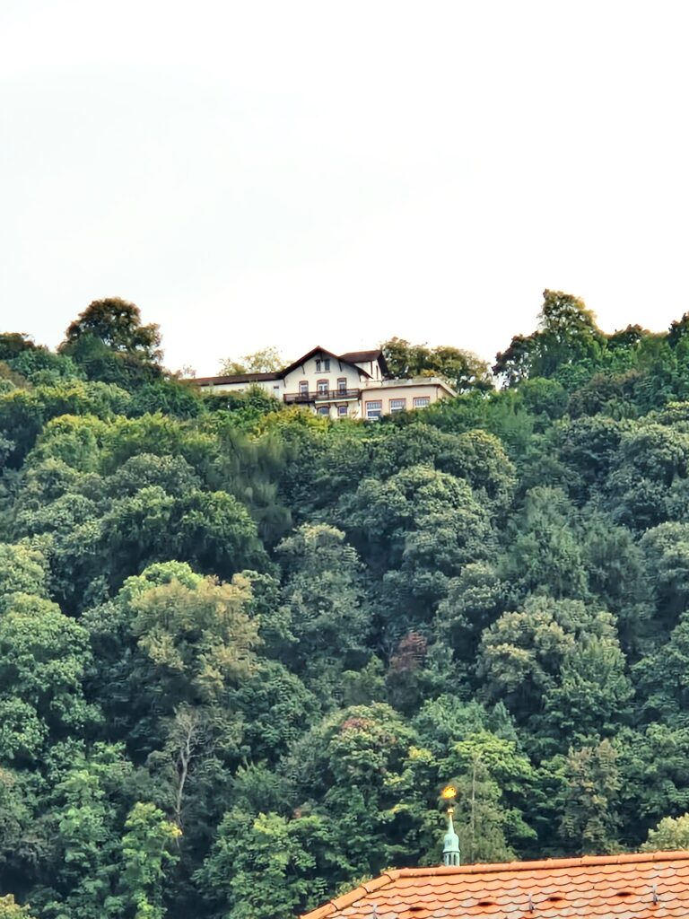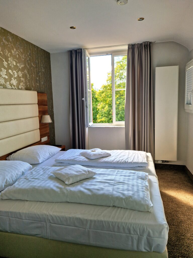 För att ta sig till Schlosshotel Molkenkur lämnar vi Heidelbergs stadskärna och tar oss via serpentinväg uppåt. Betydligt längre upp än vad vi trott. Vi tar oss förbi slottet och till sist når vi hotellet och parkeringen som är precis utanför. Vi checkar in och jag förväntar mig ett ordinarie dubbelrum som jag betalt för, men det är visst vår turdag i dag. När vi baxat upp resväskorna till högsta våningsplan får vi hotellets bästa rum med utsikt över hela floden Neckar och den vackra bron samt stora delar av hela Heidelberg. Dessutom är det en hel svit med stort sovrum, vardagsrum och ett fräscht badrum.
