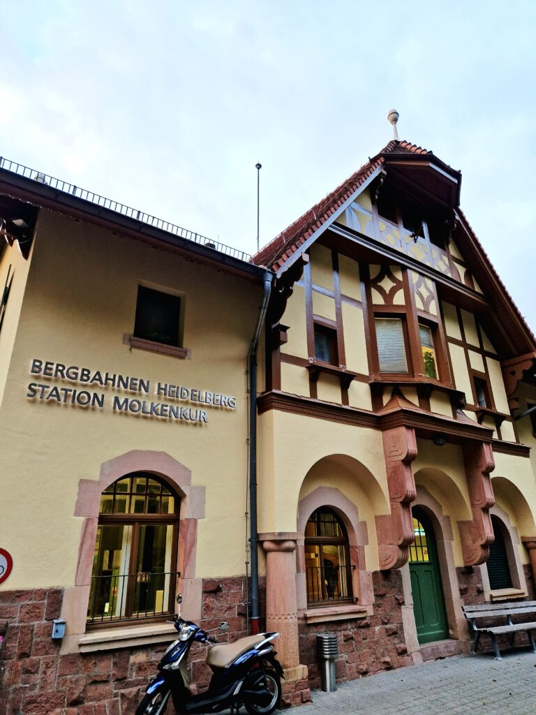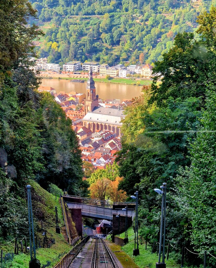 En smidig bergbana tar oss nedför och framför allt uppför. Den går ofta och någon väntetid upplever vi inte alls, trots många besökare i Heidelberg särskilt mellan slottet och staden.