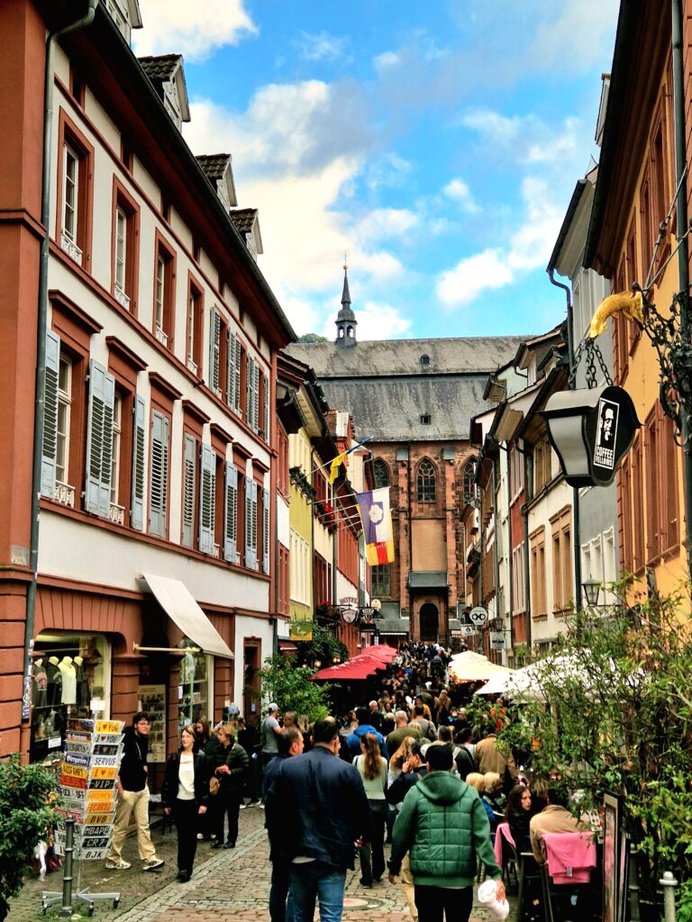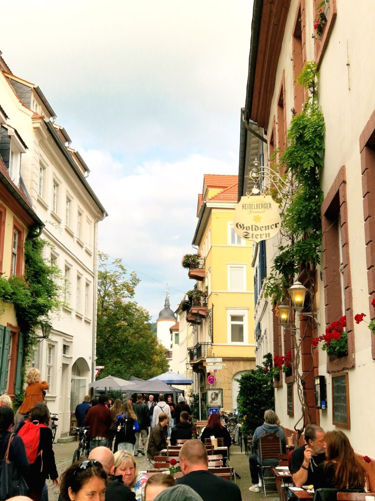 Är det något som tyskarna kan så är det att gå man ur huse för att ha trevligt på stan tillsammans med sina grannar. Heidelberg är ju inte heller bara någon ”vanlig” stad. Stadens skönhet lockar många besökare, och det märks, redan tidigt på eftermiddagen möts vi av ett myllrande folkliv när vi rullar in med bilen.