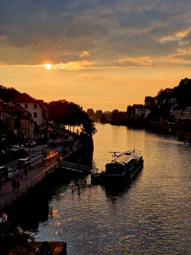 Efter en eftermiddag blandad av historia, kullerstensgränder och storslagna vyer, står vi vid Alte Brücke. Solen håller på att gå ned bakom bergen, och på floden Neckar tuffar en och annan båt fram. Trots den stora mängd av människor som befinner sig på bron är det ändå en viss stillhet som råder här.