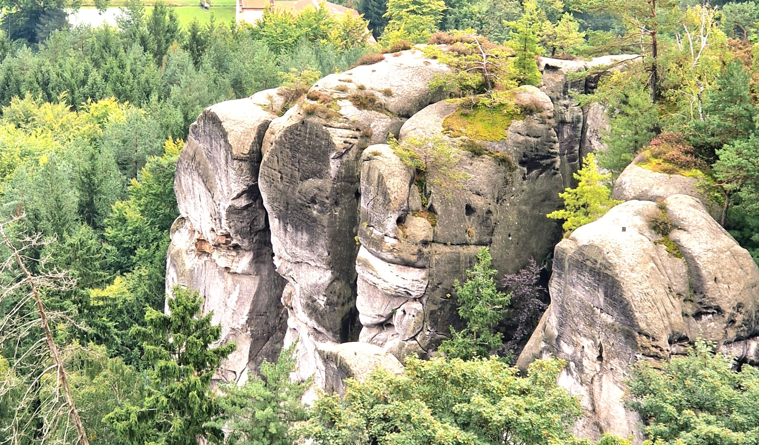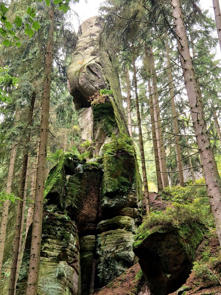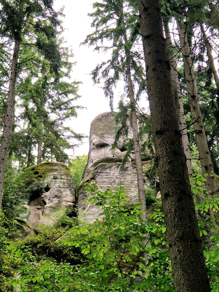 Den råder en lite mystisk stämning här i skogen bland de enorma stenbumlingarna som tittar fram när man som minst anar. Det ska även finnas ett par utsiktsplatser i området men vi nöjer oss med den lilla rundturen från slottet Hrubá Skalá innan vi nås av mera regn.