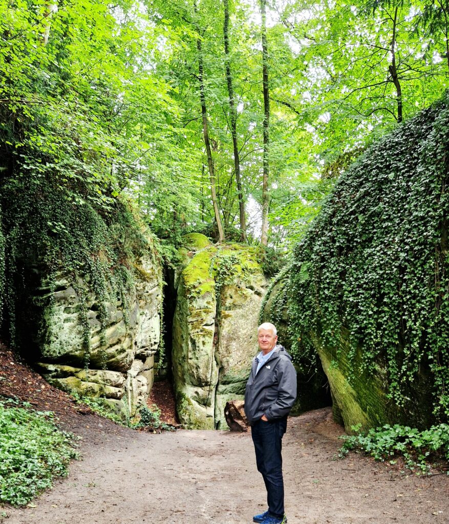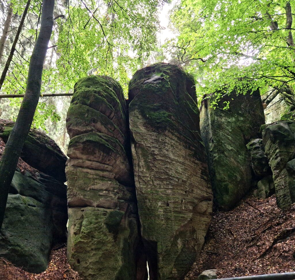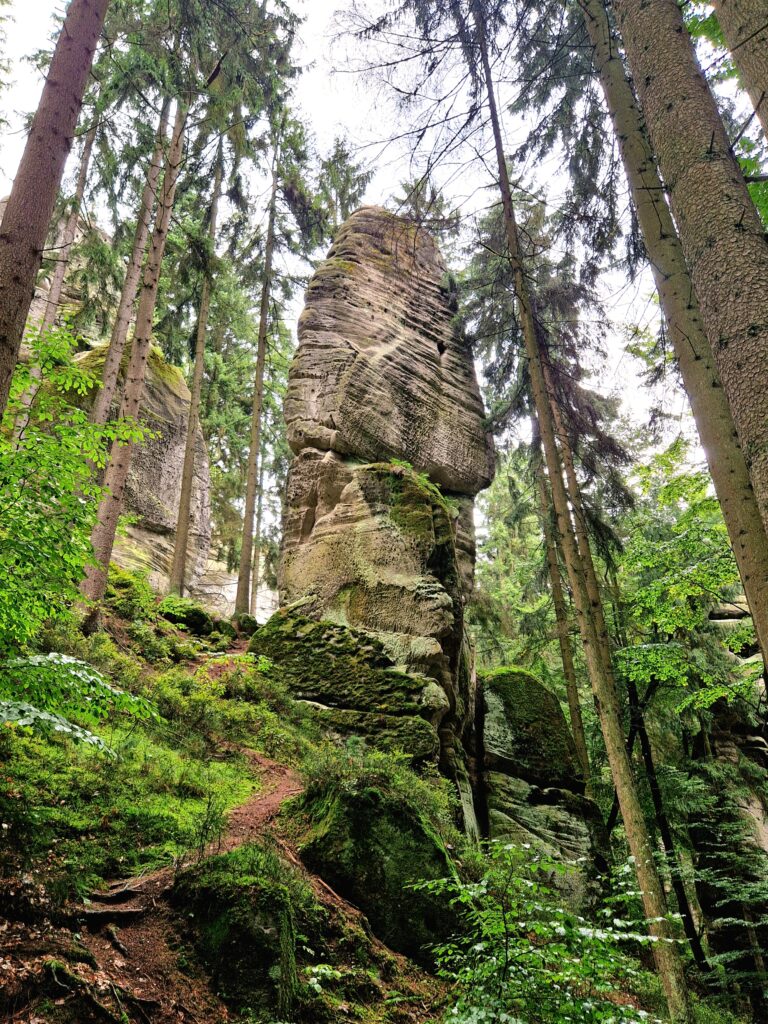 De trånga gångarna leder oss fram mot en trappa där vi till sist kommer ut i en lummig skog. Här ser vi att man kan ta sig till olika delar av naturområdet. Vi tar oss norrut och här blir stigen bredare samtidigt som vi kan spana in de mäktiga stenformationerna som ligger utspridda lite här och var. Den ena stenen häftigare än den andra. Det känns onekligen som vi har kommit in i jättarnas land.