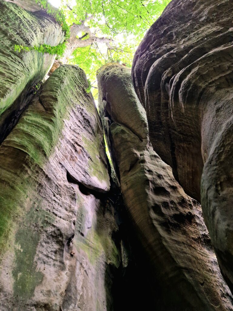 Vi anar inte vad som väntar oss, men det blir bara mer och mer spännande. Det är en helt ny värld som öppnar sig när vi kommer ned mot den första delen av området. Alltså, wow, vi ser en ingång i berget och traskar vidare nedåt. Här förstår jag att vi kommit fram till det naturområde där de enorma stenformationerna finns. Jag har hört talas om dem eller läst om dem någonstans men hade inte kopplat ihop området med Hrubá Skalá.