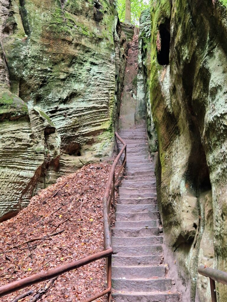 Egentligen hade jag faktiskt ingen aning om att det här naturområdet låg här i Hrubá Skalá. Vi var ju på jakt efter slott när vi ramlar över området av en ren slump. När vi checkat in på slottet Hrubá Skalá är vi ganska hungriga men det är en bra stund innan det är dags för middag. Ett mellanmål skulle ändå passa bra och precis utanför slottsporten ligger en liten servering med enklare rätter. Vi köper en varsin korv med bröd och en öl. Serveringen har bord och stolar och när vi sitter här och äter som bäst ser maken en spännande men ganska anspråkslös trappa som går ned i skogen. Den måste vi förstås testa. Vi äter snabbt upp och ger oss iväg ned mot trapporna.