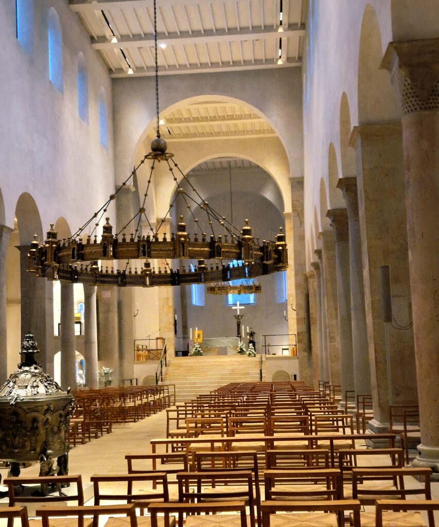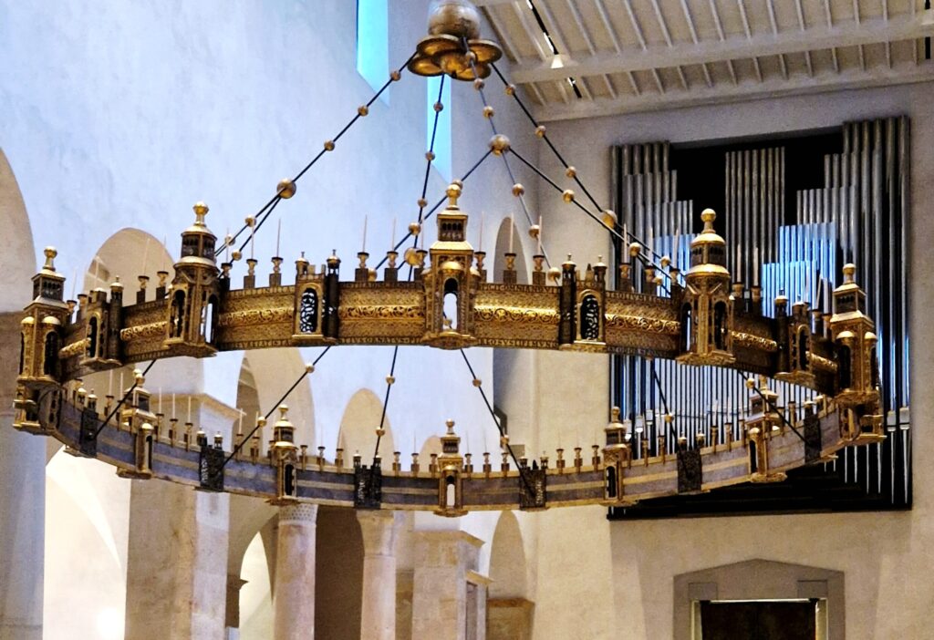 Det första vi ser när vi kommer in i den mäktiga katedralens mittskepp är den så vackra, Hezilos (Heziloleuchter) ljuskrona, en av Mariendomens mest imponerande konstskatter. Den tillkom under biskop Hezilos tid på 1000-talet och är tillverkad i förgylld brons med en diameter på omkring sex meter. Ljuskronan är ringformad och kallas ibland Himmelkrone ”himlens krona”, eftersom den symboliserar det himmelska Jerusalem. Ringen är dekorerad med små städer, portar och torn som representerar den himmelska staden.