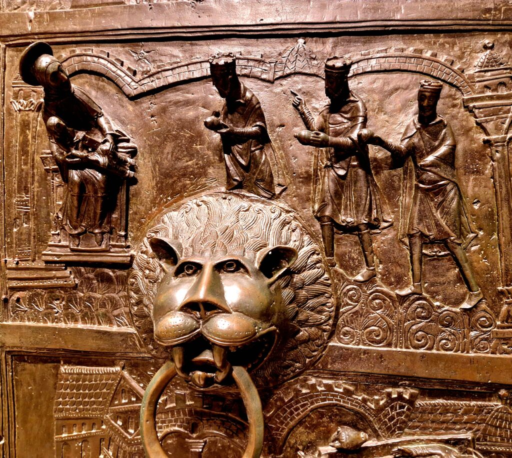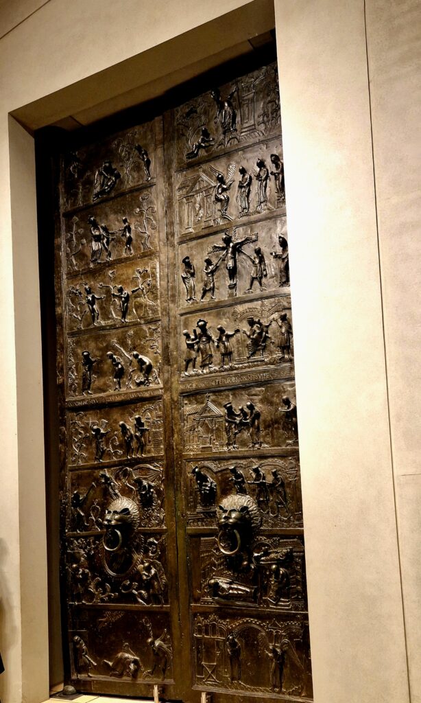 Den vänstra dörren skildrar scener ur Gamla testamentet, från Adams och Evas skapelse till Kains mord på Abel. Den högra dörren visar scener ur Jesu liv, parallellt med de gamla testamentets berättelser. Dörrarnas figurer är ovanligt uttrycksfulla för sin tid, ansiktsuttryck, kroppsrörelser och känslouttryck är detaljerade och levande. Det är en visuell predikan i brons. Mäkta imponerande!