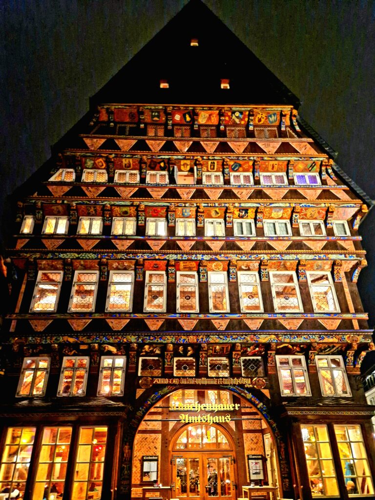 Vi avslutar vår kväll med ett återbesök vid Markplatz och det vackra korsvirkeshuset, Knochenhaueramtshaus, för en middag på restaurangen som ligger i huset. Här serveras klassisk tysk mat och som alltid innan vi lämnar Tyskland är det schnitzel som gäller, gärna med en god sås och ett glas rött vin. Helst ska det vara öl men inte på hösten.