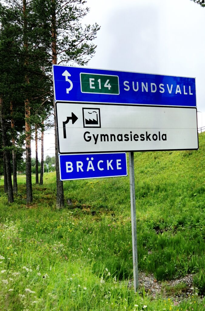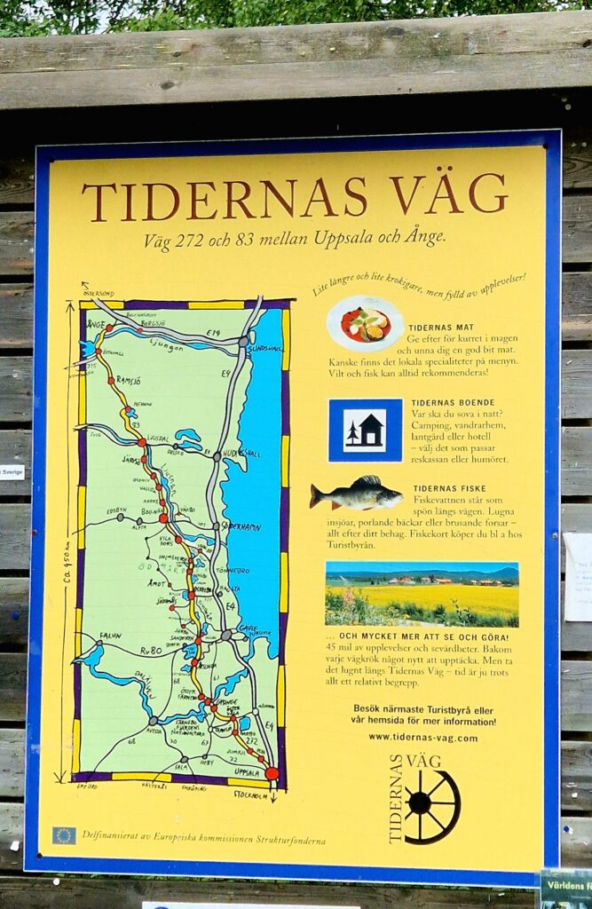 På en stor skylt ser vi information om ”Tidernas väg”. Det är en tematisk turistväg genom norra Sverige. Längs vägen möter resenären även skogar, sjöar och naturområden som inbjuder till kortare promenader, vandringar och pauser i inlandets stillsamma landskap. Tidernas väg passerar dessutom kulturella och historiska platser såsom kyrkor, byar och Ånge järnvägsmuseum, vilket ger möjlighet att uppleva både natur och kultur under samma resa.