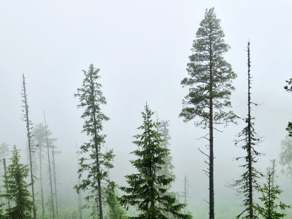 När vi konstaterar att mittpunkten ligger i Ånge kommun är det förstås givet att vi åker dit, även om vädret inte är på vår sida. Efter en sträcka genom skogarna och följande av vägskyltarna drar ett rejält oväder in. Platsen ligger högt och bjuder normalt på vidsträckta vyer, men den här gången möts vi bara av tät, vit dimma. Trots det kan vi ändå pricka av Sveriges geografiska mittpunkt.