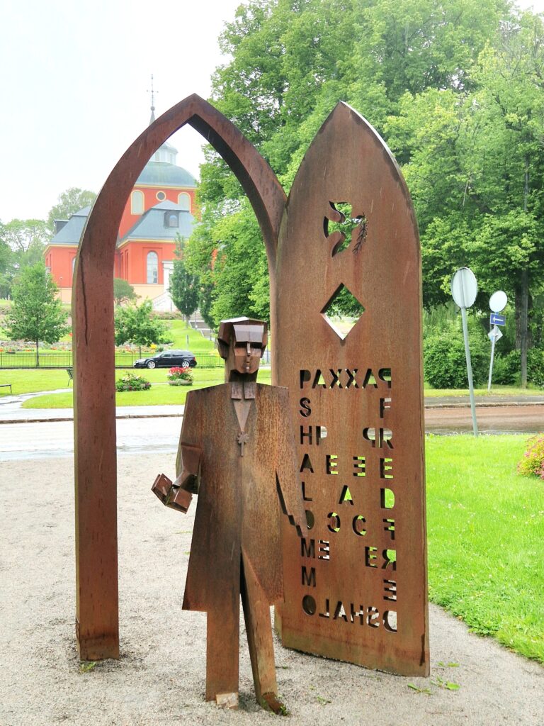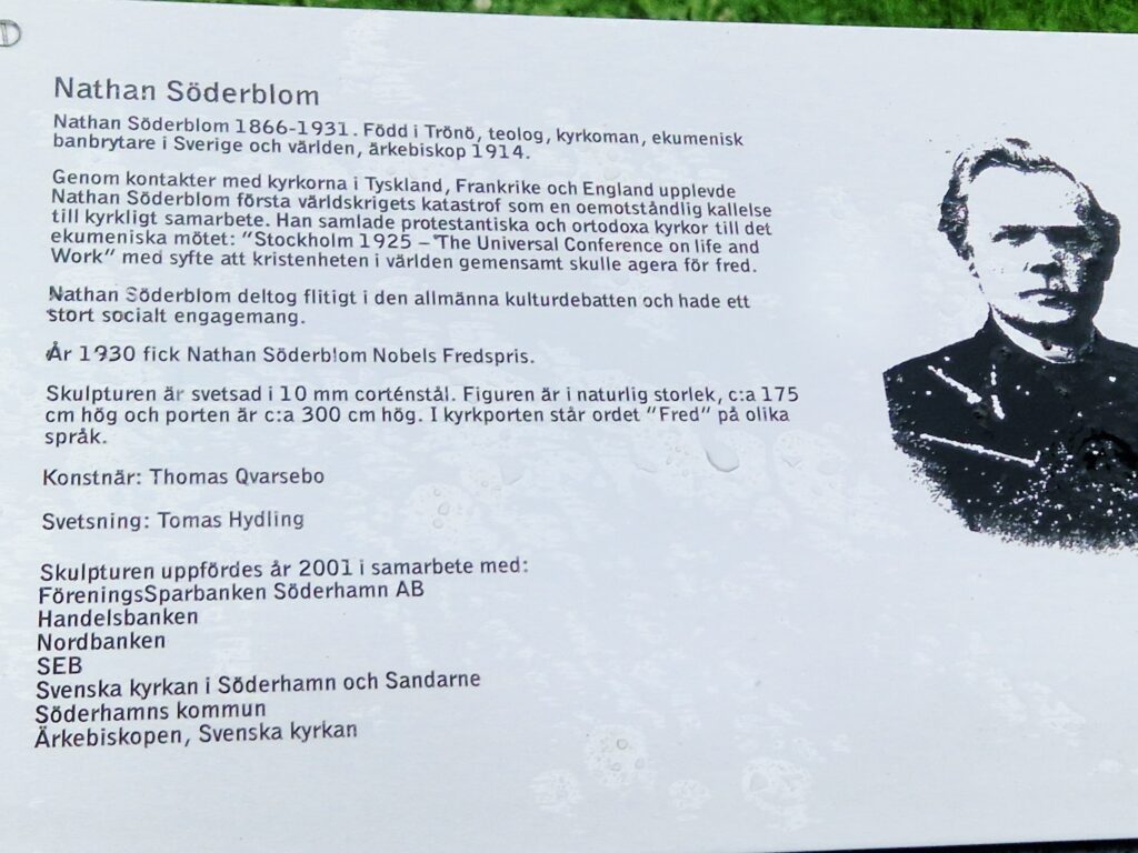 Konstverket av Nathan Söderblom är gjort i corténstål och visar honom i en kyrkport med ordet “Fred” på flera språk, ett uttryck för hans fredsarbete. Skulpturen sattes upp år 2001 och är ca 3 meter hög inklusive porten, medan själva figuren är i naturlig människostorlek.