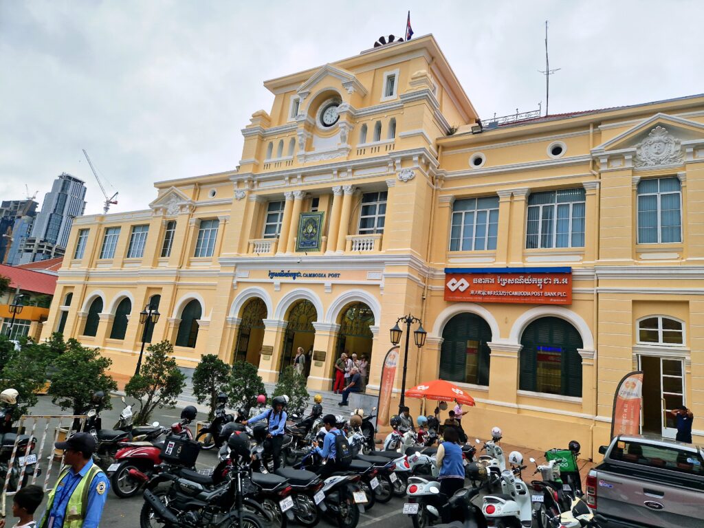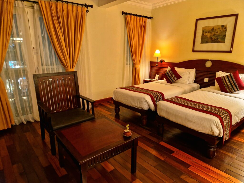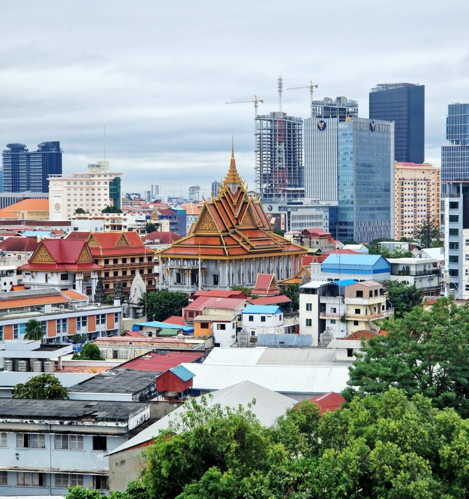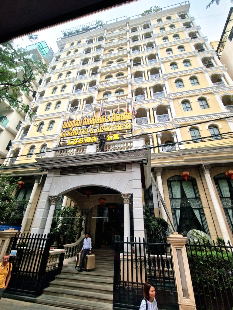 Vår dag inleds med en härlig sovmorgon och vi passar på att ta det lite lugnt innan avfärd vid lunchtid. Vi äter frukost inomhus eftersom det är lite ostadigt väder. Inget regn men det är lite blåsigt uppe på nionde våningen. Här uppifrån har vi också en utmärkt utsikt över olika delar av Phnom Penh.
