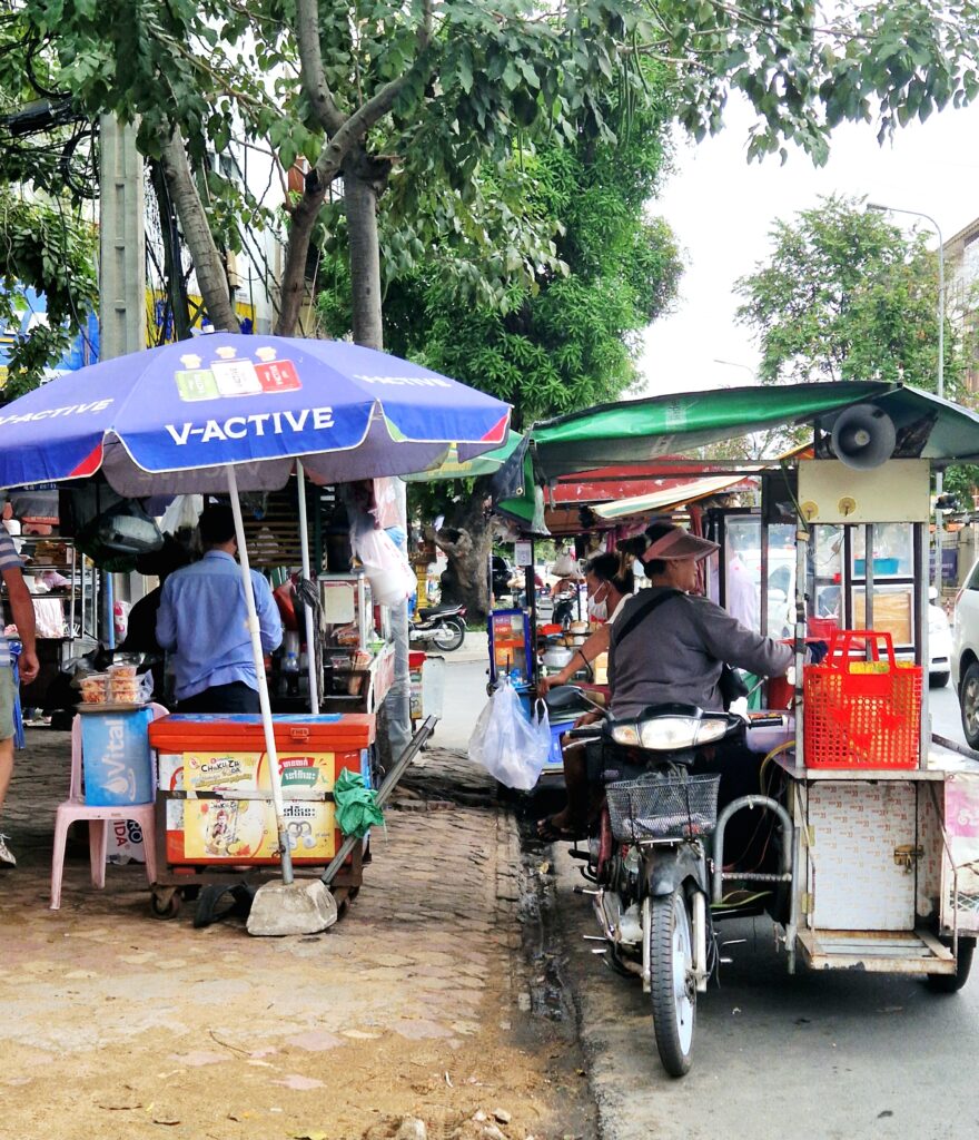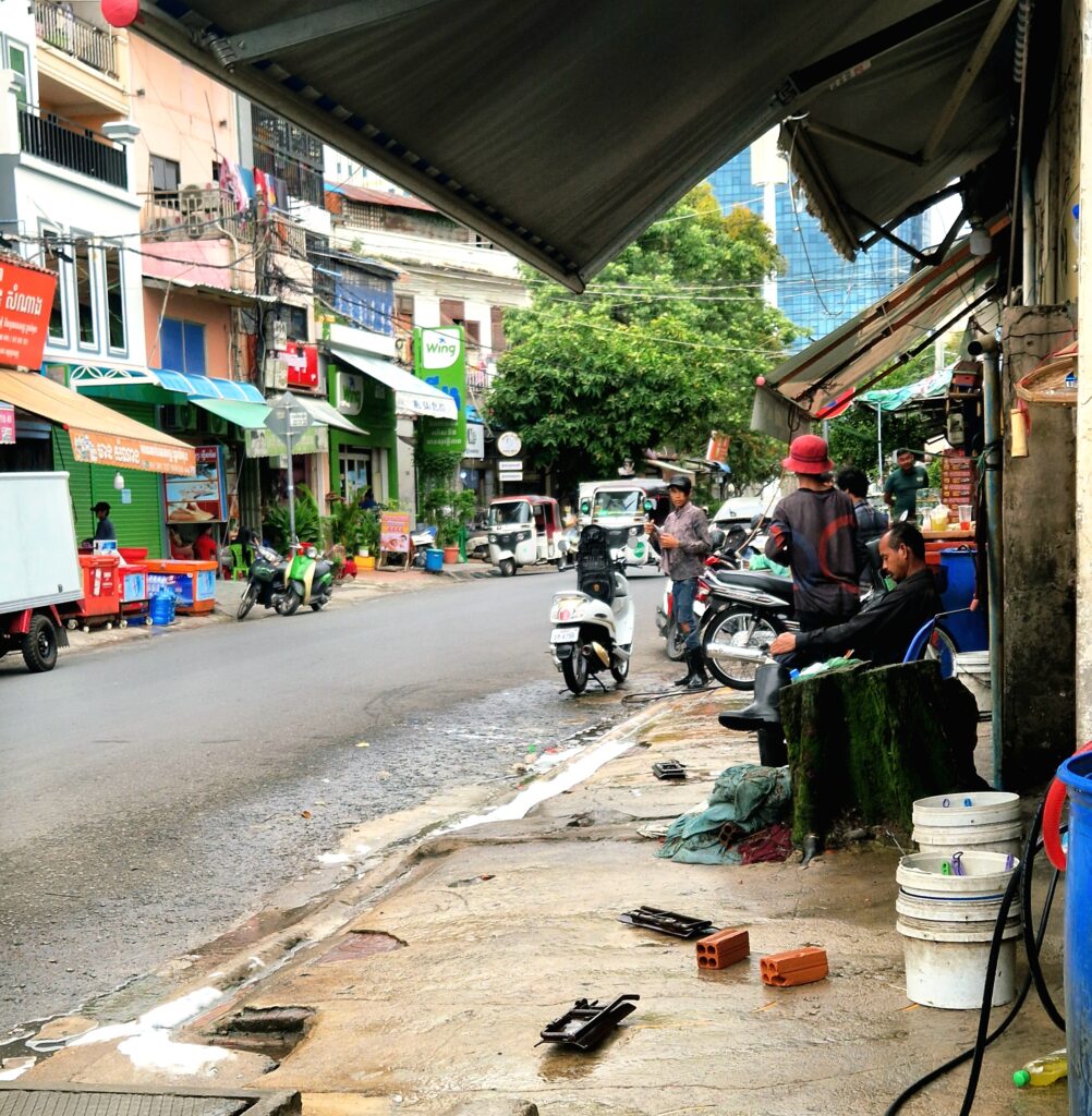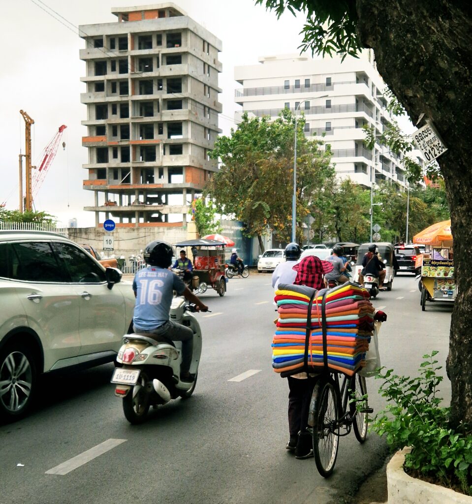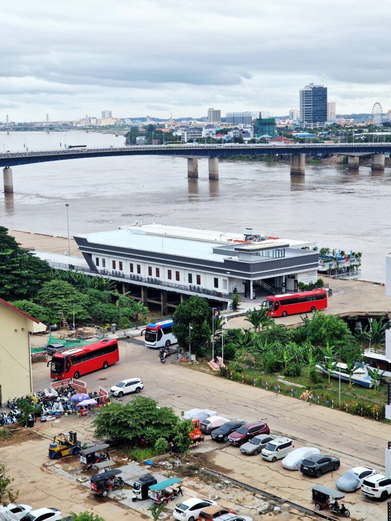 Vi lämnar hotellet och åker någon kilometer som tar nästan lika lång tid som att promenera bort till hamnen. Oavsett tidpunkt är trafiken väldigt intensiv i Phnom Penh.