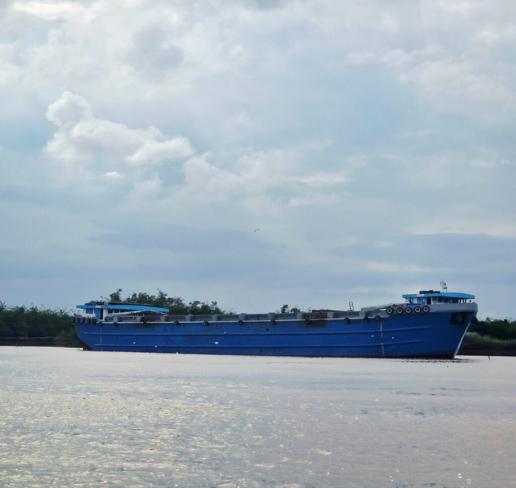 På Mekongfloden händer det inte så mycket mer än att vi passerar båtar som verkar hålla på med något slags underhållsarbete med floden. Vi kan se ett par byar men annars är det ganska lugnt med trafik.