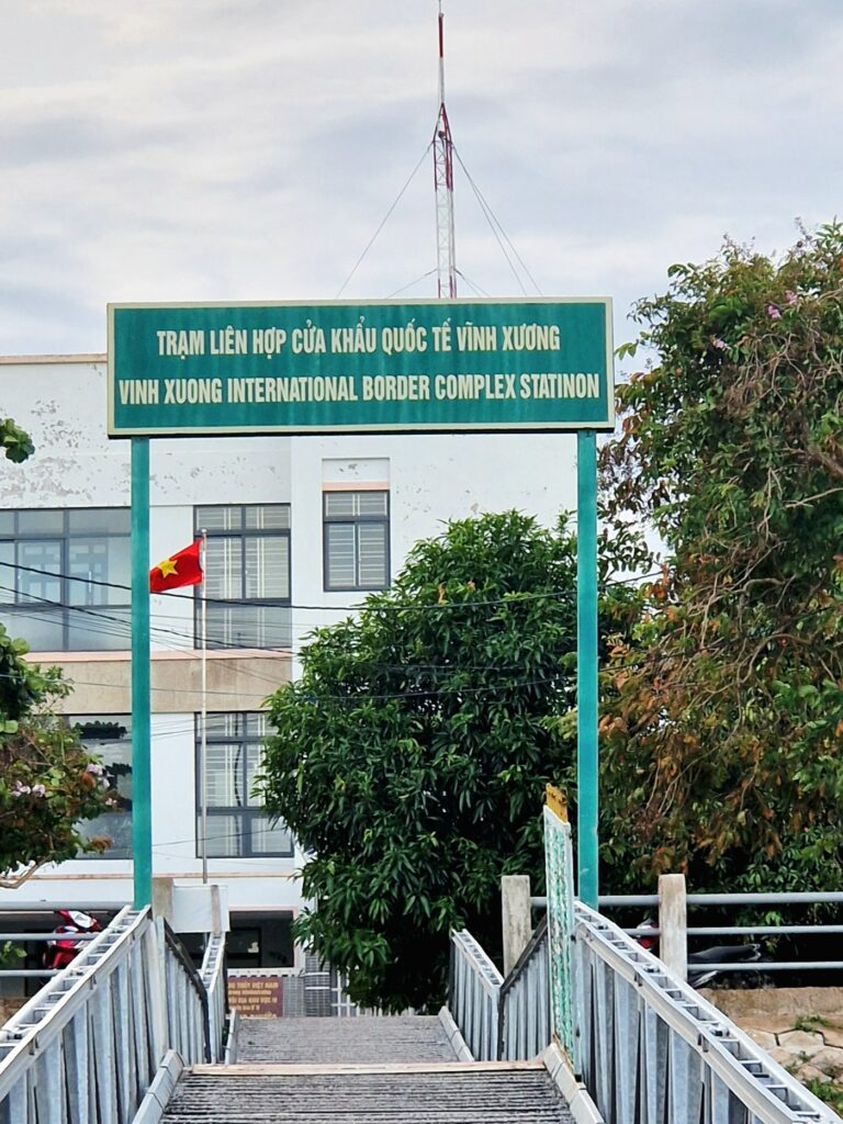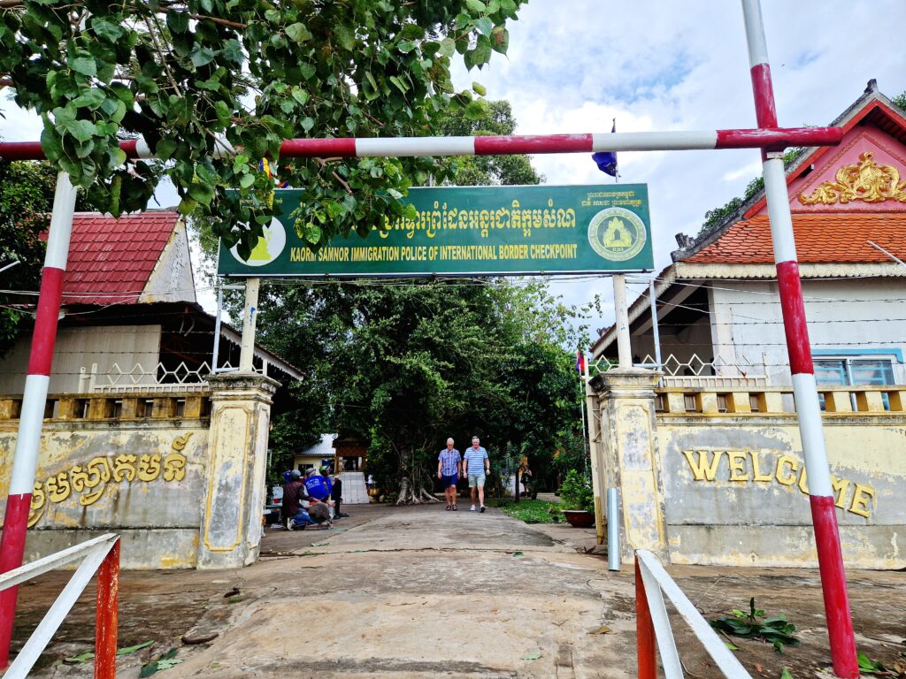 Efter drygt tre timmar når vi den kambodjanska gränsen och äntligen får vi gå i land. Här ska vi gå igenom en liten speciell procedur för att kunna lämna landet.