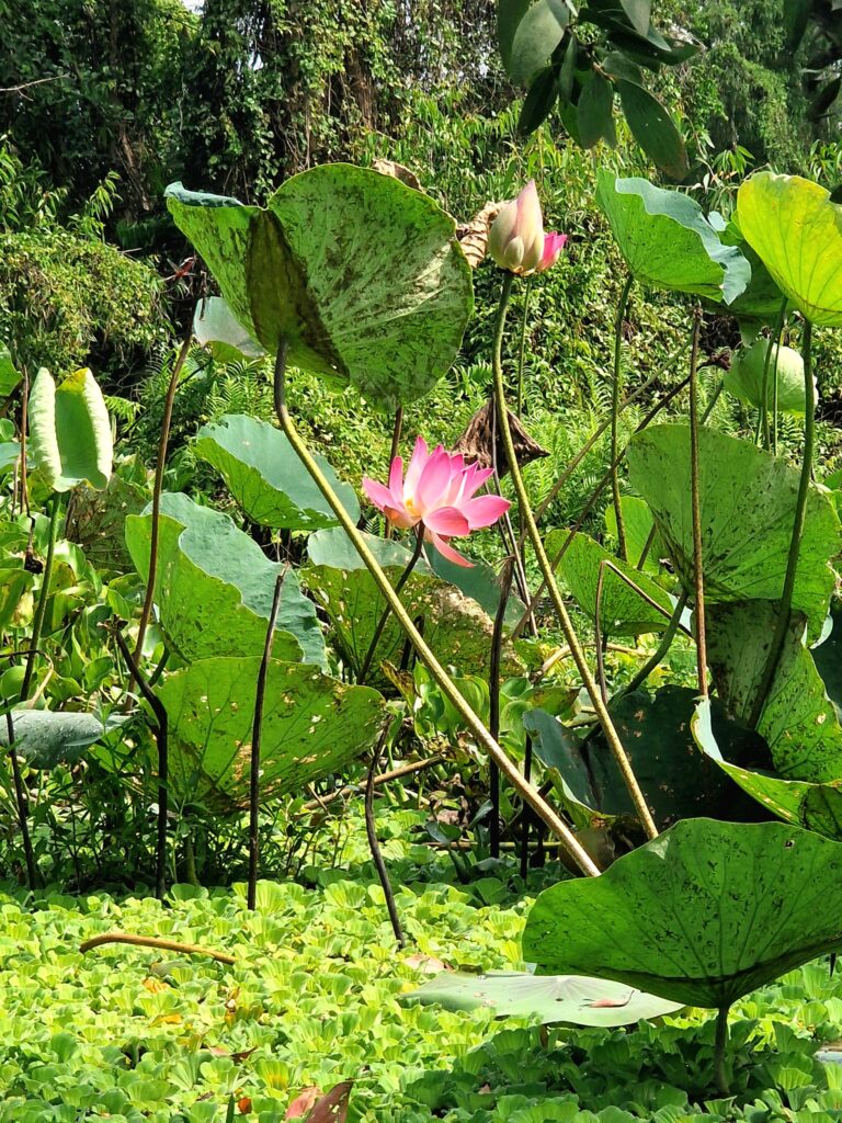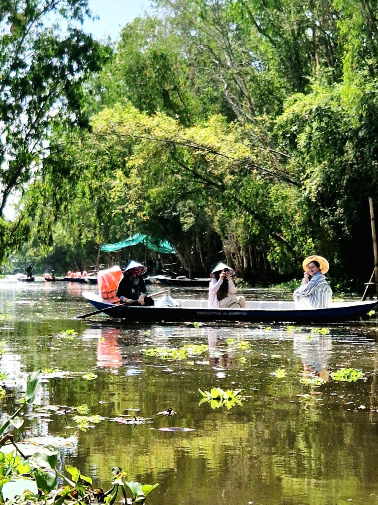 Att båtarna är lite mindre betyder att vi kan ta oss genom de smalare kanalerna. Här är allt mer stillsamt, man kan höra fåglarnas läten, känna doften av vatten och nästan ta på vegetationen vi glider förbi. Kombinationen av de två olika båtarna, först motorbåt, sedan roddbåt, gör att upplevelsen av Tra Su blir både storslagen och rofyllt på samma gång.