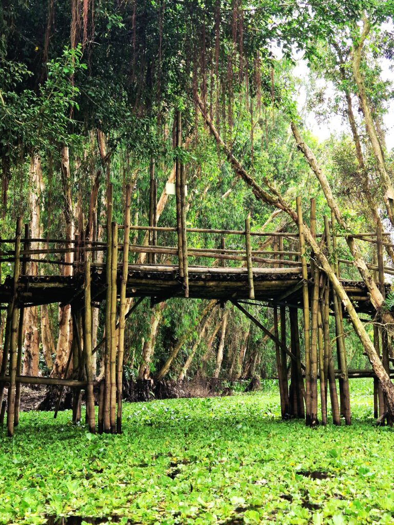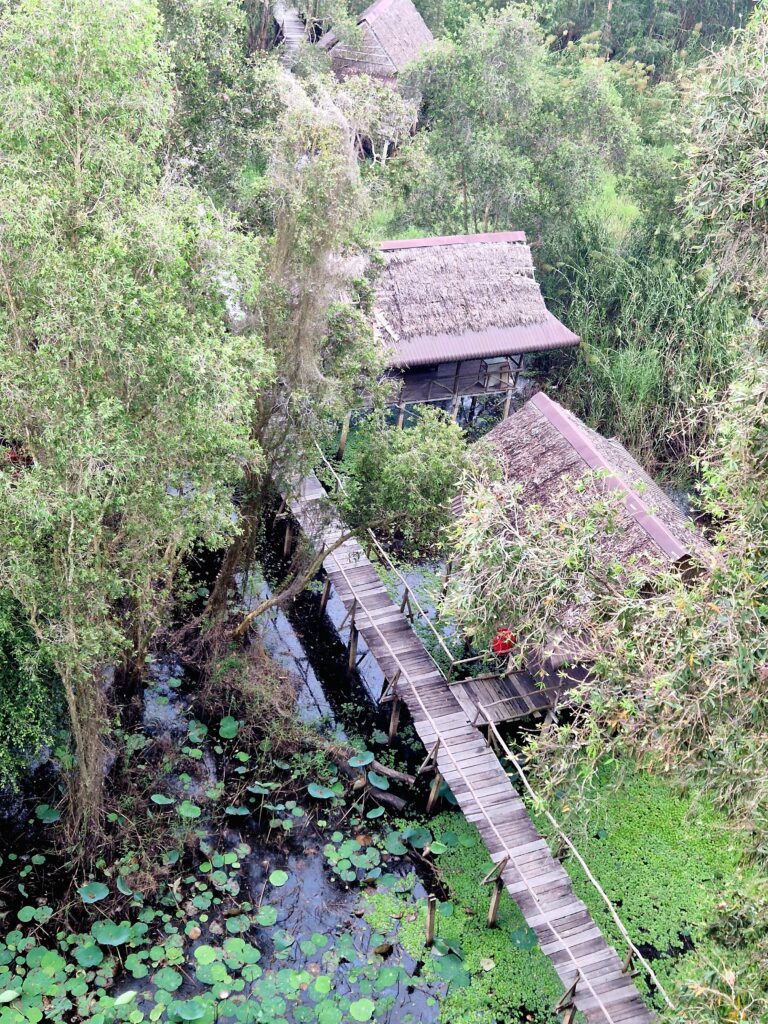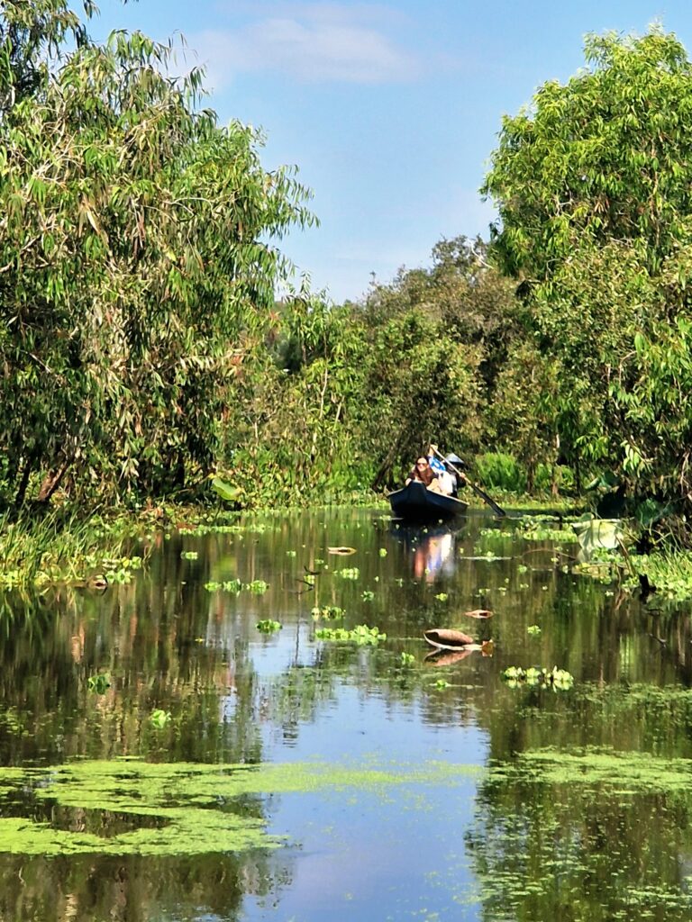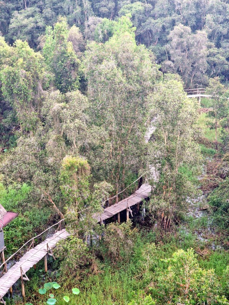 Väl på plats får vi stiga ombord på en båt med motor, en så kallad ”tac rang”, som tar oss vidare längs de breda kanalerna in i reservatet. Trots att båten har motor är känslan att den glider stillsamt genom det lugna vattnet och ger en första vy över de lummiga mangroveträsken och de spegelblanka sjöarna. Efter en stund når vi en utsiktsplats där vi stannar för att ta oss upp till ett utsiktstorn där vi kan beundra den vidsträckta naturen.