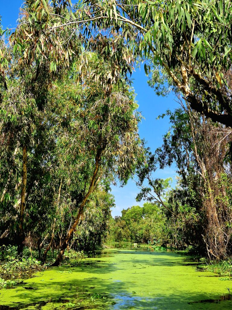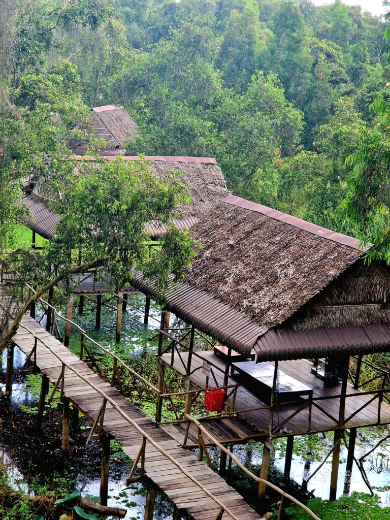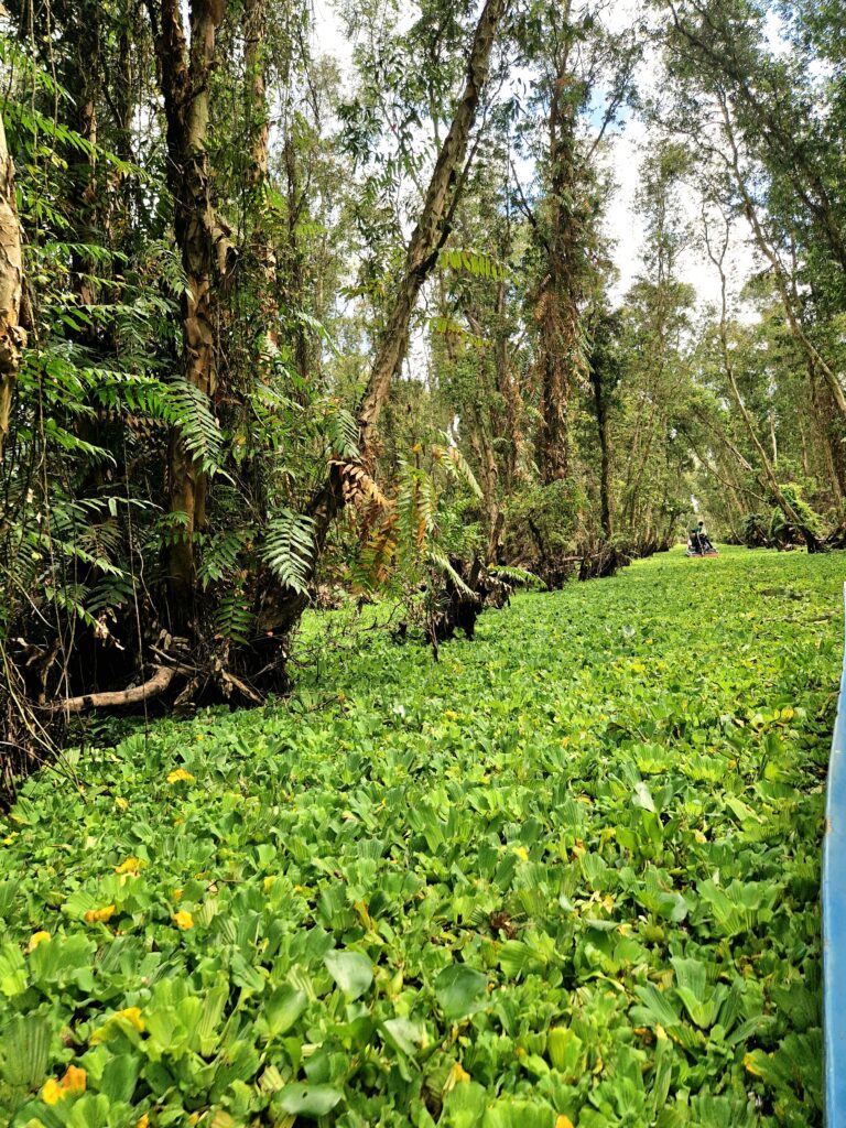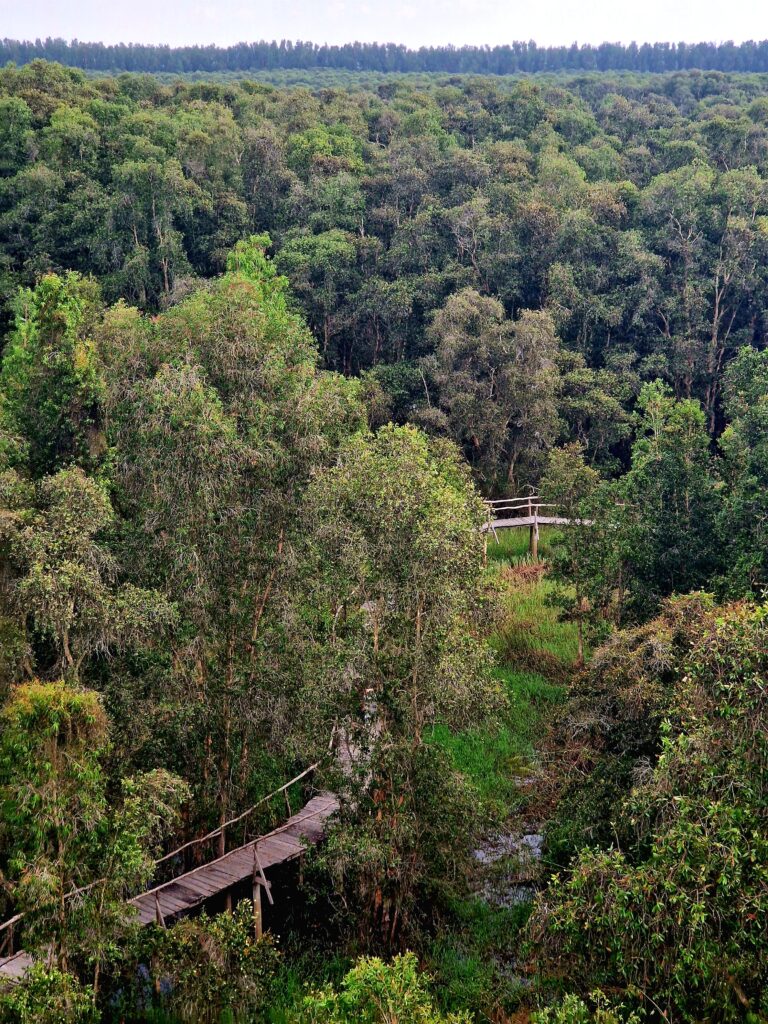 Väl på plats får vi stiga ombord på en båt med motor, en så kallad ”tac rang”, som tar oss vidare längs de breda kanalerna in i reservatet. Trots att båten har motor är känslan att den glider stillsamt genom det lugna vattnet och ger en första vy över de lummiga mangroveträsken och de spegelblanka sjöarna. Efter en stund når vi en utsiktsplats där vi stannar för att ta oss upp till ett utsiktstorn där vi kan beundra den vidsträckta naturen.