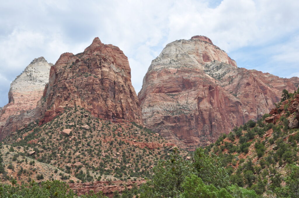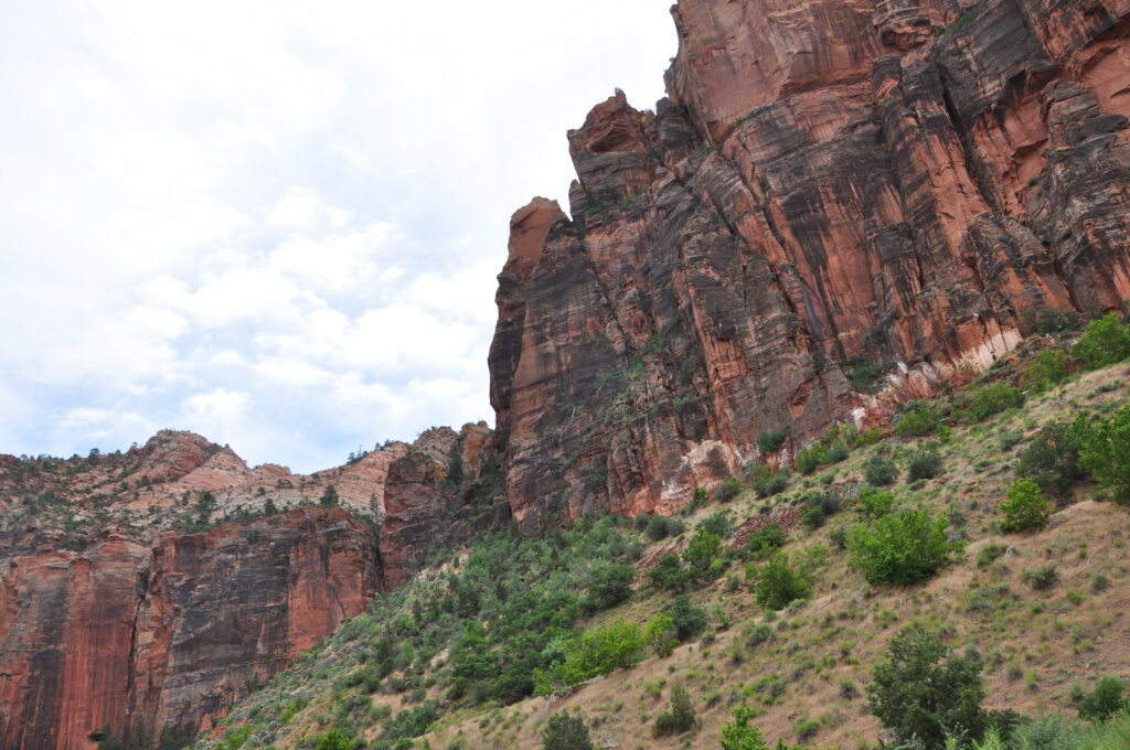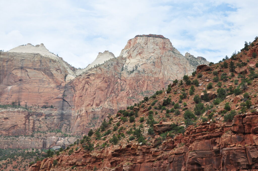 Man kan också välja att ställa bilen och istället ta shuttlelbussar. Från shuttelbussen får man se Zion i sin mest ikoniska form, eftersom den går rakt genom Zion Canyon, parkens hjärta. Resan följer dalbotten och ger nära vyer av de höga klippväggarna som reser sig hundratals meter på båda sidor.