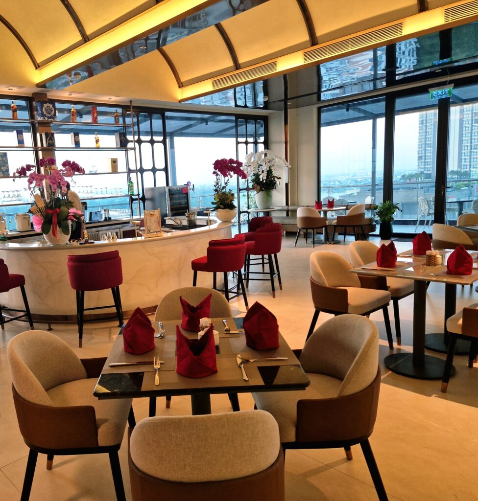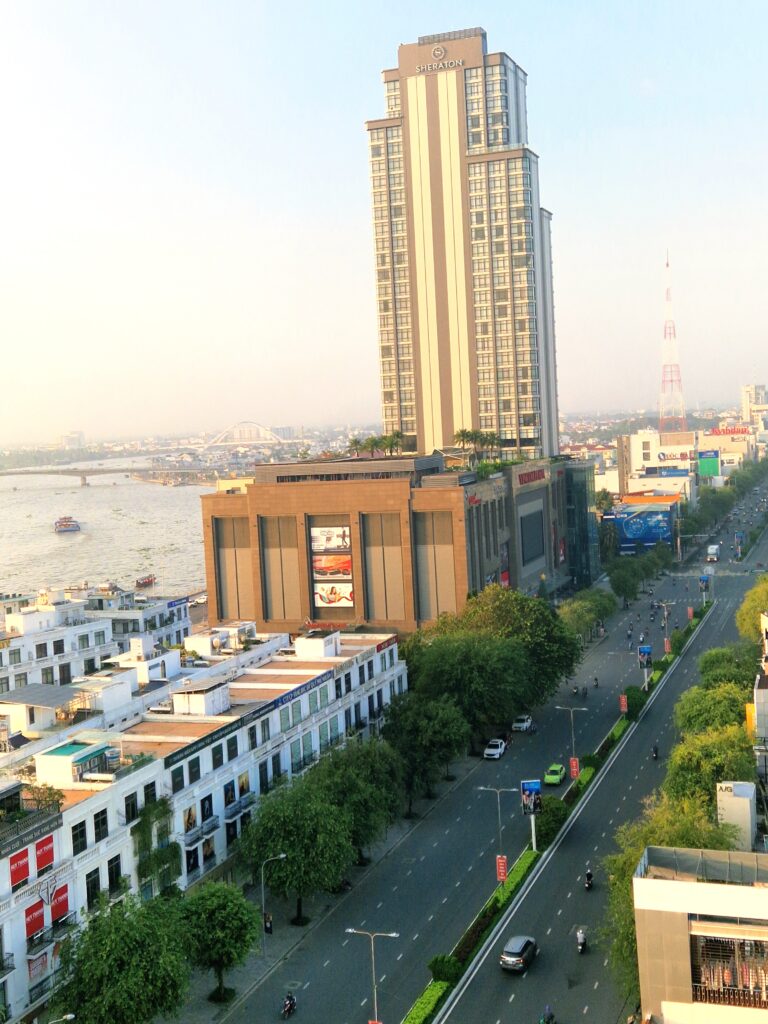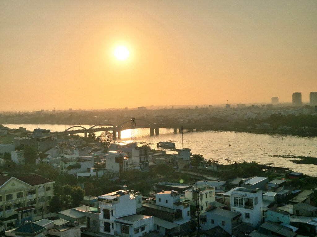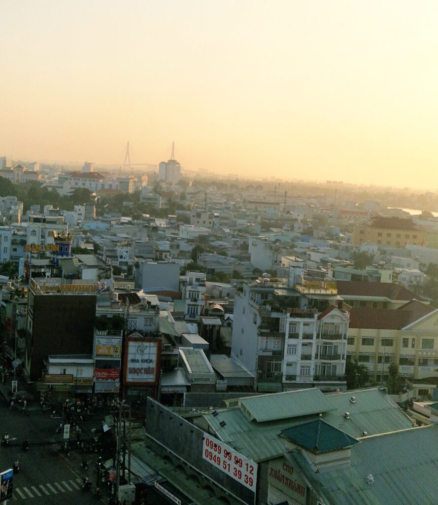 Vår tolfte dag inleds med lite vyer högt upp från hotellets matsal och där man har en terrass som är möjligt att gå ut på. Här uppe har vi milsvid utsikt över floden och staden, Can Tho som känns väldigt stort uppifrån terrassen.