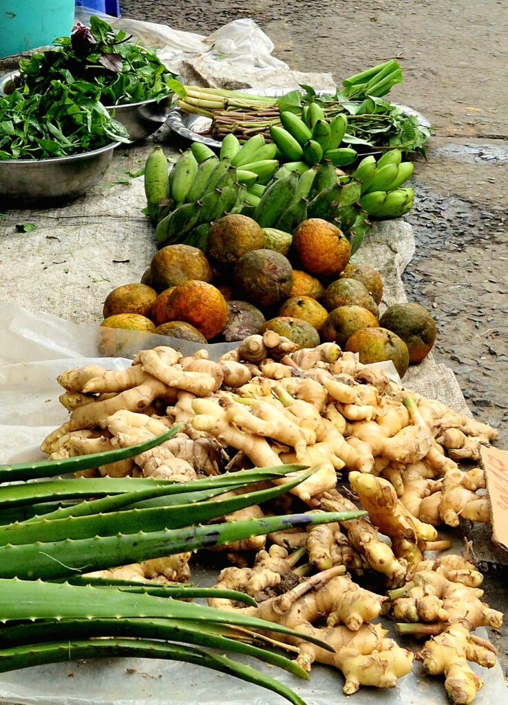 På utsidan är det riktigt trevligt att strosa runt. Det finns många spännande grönsaker och frukter som är ovanliga att se hemma i Sverige, och samtidigt hittar vi en hel del varor som kostar betydligt mer hemmavid än vad de gör på marknaden här.