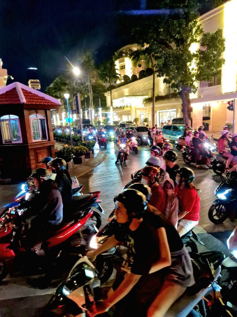 Snart mörknar det över Saigon och gatorna fylls av människor och vespor, och de större avenyerna lyser upp av neonskyltar från butiker, restauranger och barer. Ett populärt område är Nguyen Hue Walking Street, som på kvällstid blir en samlingsplats med musik, ljus och folkfeststämning.
