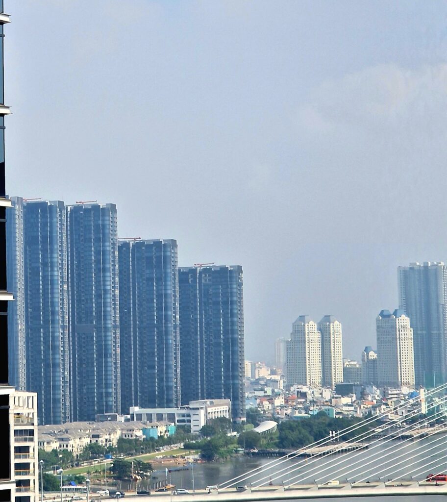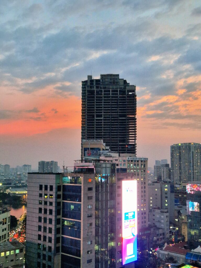 Från vår takterrass kan vi se hur Saigonfloden rinner lugnt förbi bara en bit bort, med båtar som sakta glider fram, det är aldrig en lugn stund på floden. När eftermiddagen sakta övergår till kväll speglas ljuset i floden och ger hela vyn ett mjukt skimmer.