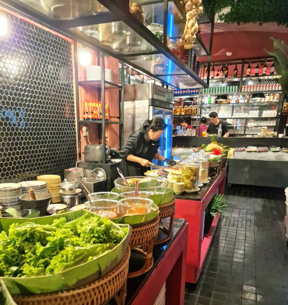 Nhà hàng Ngon är en relativt stor restaurang med flera olika avdelningar. Vi får ett bord mitt i lokalen och har mycket att titta på omkring oss. Det är fullt med folk och det händer något hela tiden, gäster kommer och går, nya rätter bärs ut och vid flera stationer kan man se maten tillagas framför ögonen på oss. Det gör hela restaurangen livlig och rolig, och man får verkligen uppleva både maten och stämningen samtidigt.
